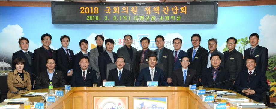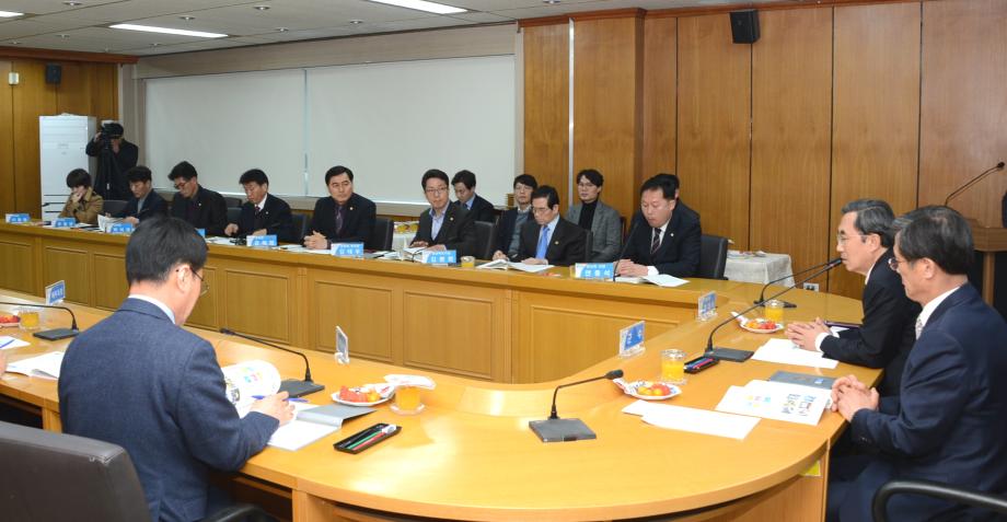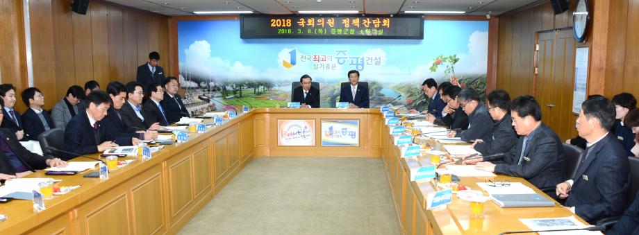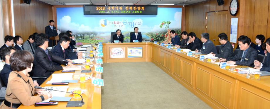 증평군은 8일 군청 2층 소회의실에서 경대수 국회의원을 초청해 정책간담회를 개최했다. 이날 정책간담회에는 홍성열 군수와 김봉회 도의원, 연종석 군의장을 비롯한 군 의원 및 실.과.사업소장 등 30여명이 참석했다.[보도자료실 참조]