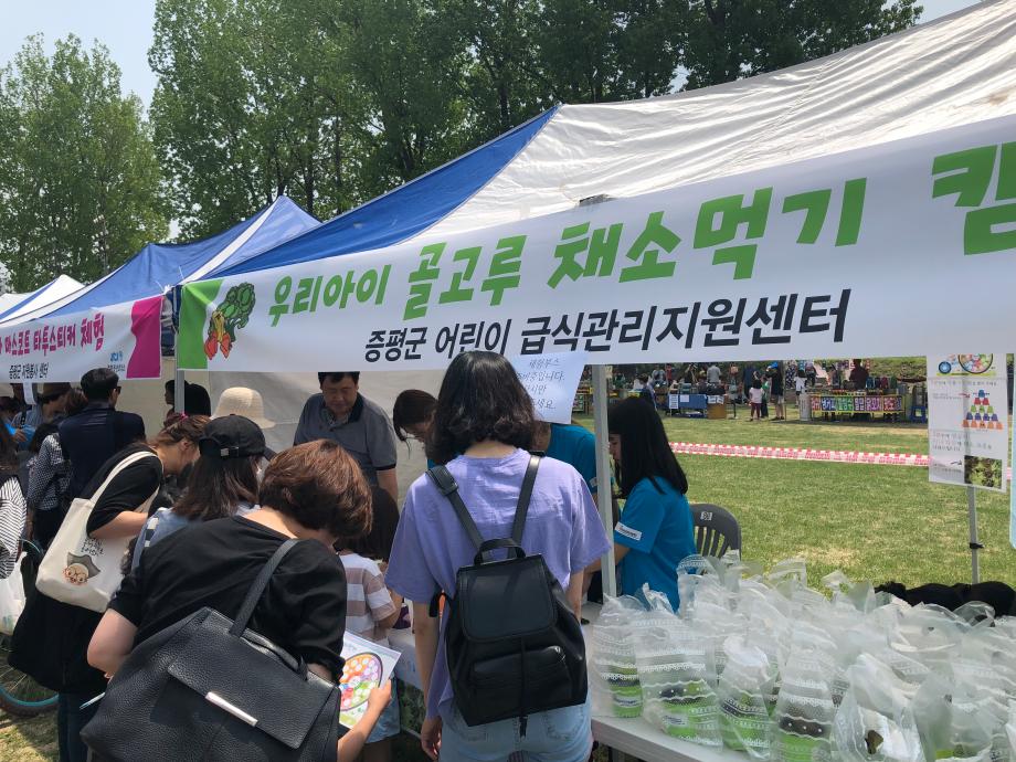 증평군어린이급식관리지원센터는 5월 4일 증평 보강천 잔디구장에서 열린 ‘어린이날 큰잔치 행사’에 참가하여 지역주민 400명을 대상으로 ‘우리 아이 골고루 채소 먹이기 캠페인’을 진행하였다.