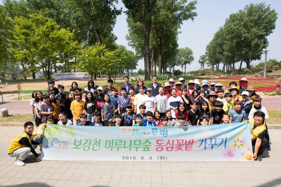 증평군을 대표하는 보강천 미루나무 숲에 고사리 손으로 정성드레 심은 꽃밭이 마련됐다.