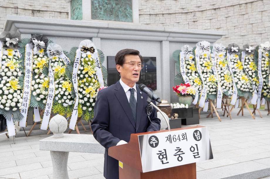 증평군은 제64회 현충일을 맞아 6일 증평읍 내성리 보건복지타운 내 충혼탑에서 홍성열 증평군수를 비롯한 보훈단체장과 보훈가족, 기관․단체장과 군민 등 300여명이 참석한 가운데 제 64회 현충일 추념식을 열었다.