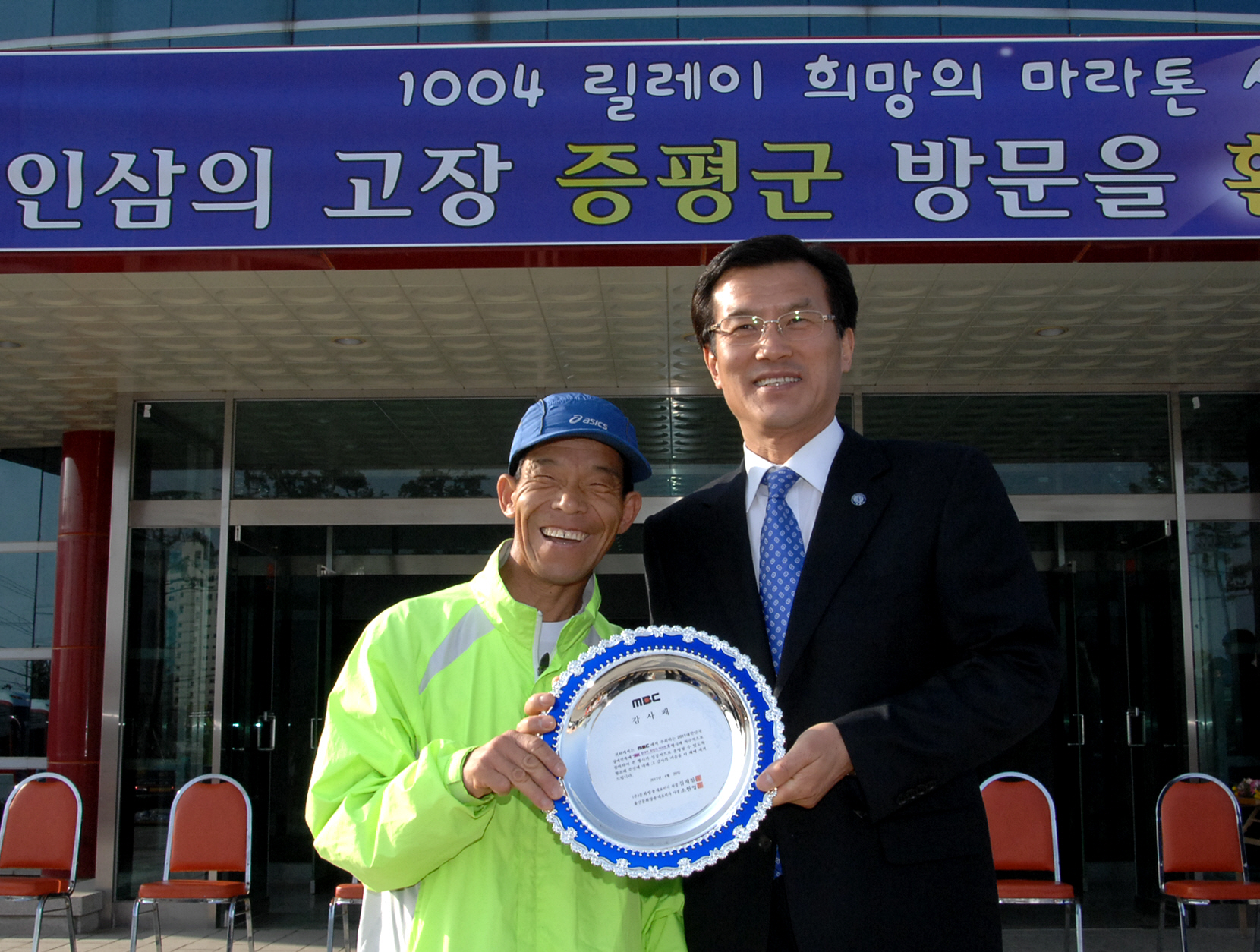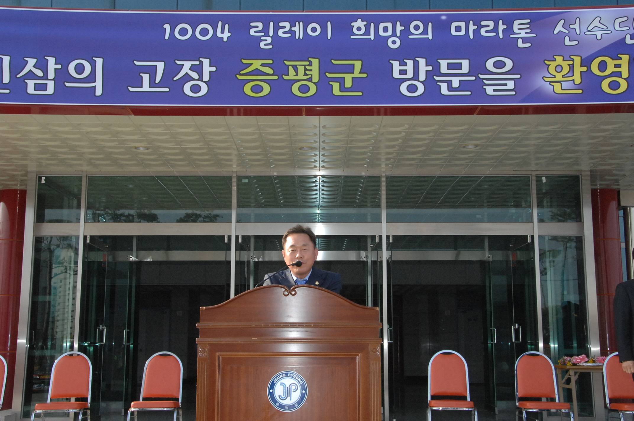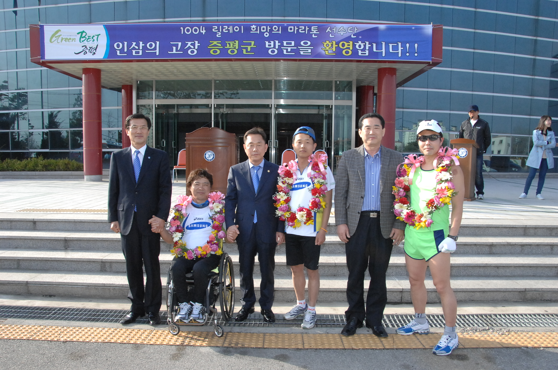 ‘1004 릴레이 희망의 마라톤’ 선수단이 8일 증평군을 지나면서 홍성열 증평군수, 김재룡 군의장을 비롯한 주민들의 열렬한 환영을 받았다.[보도자료실 참조]