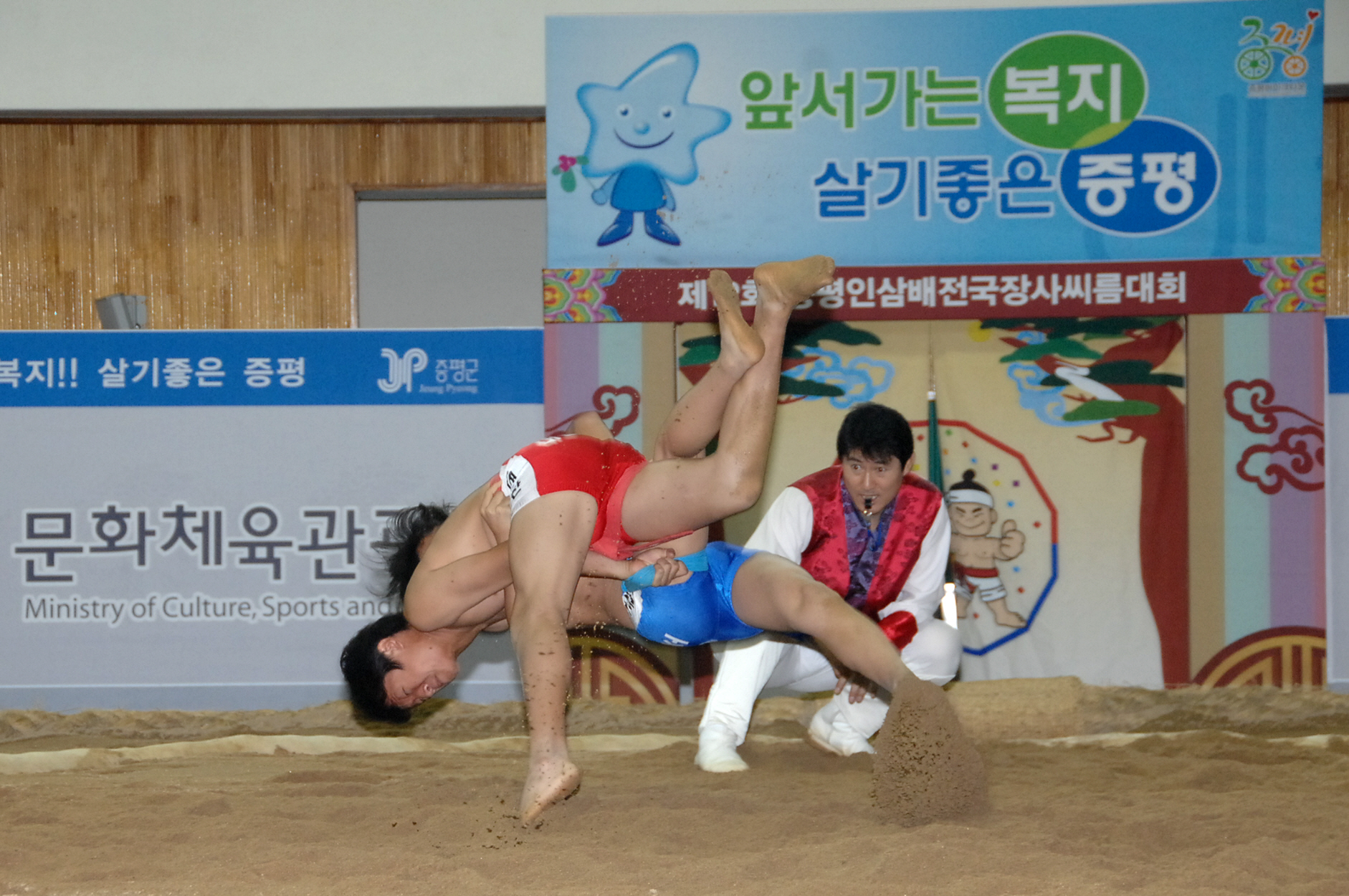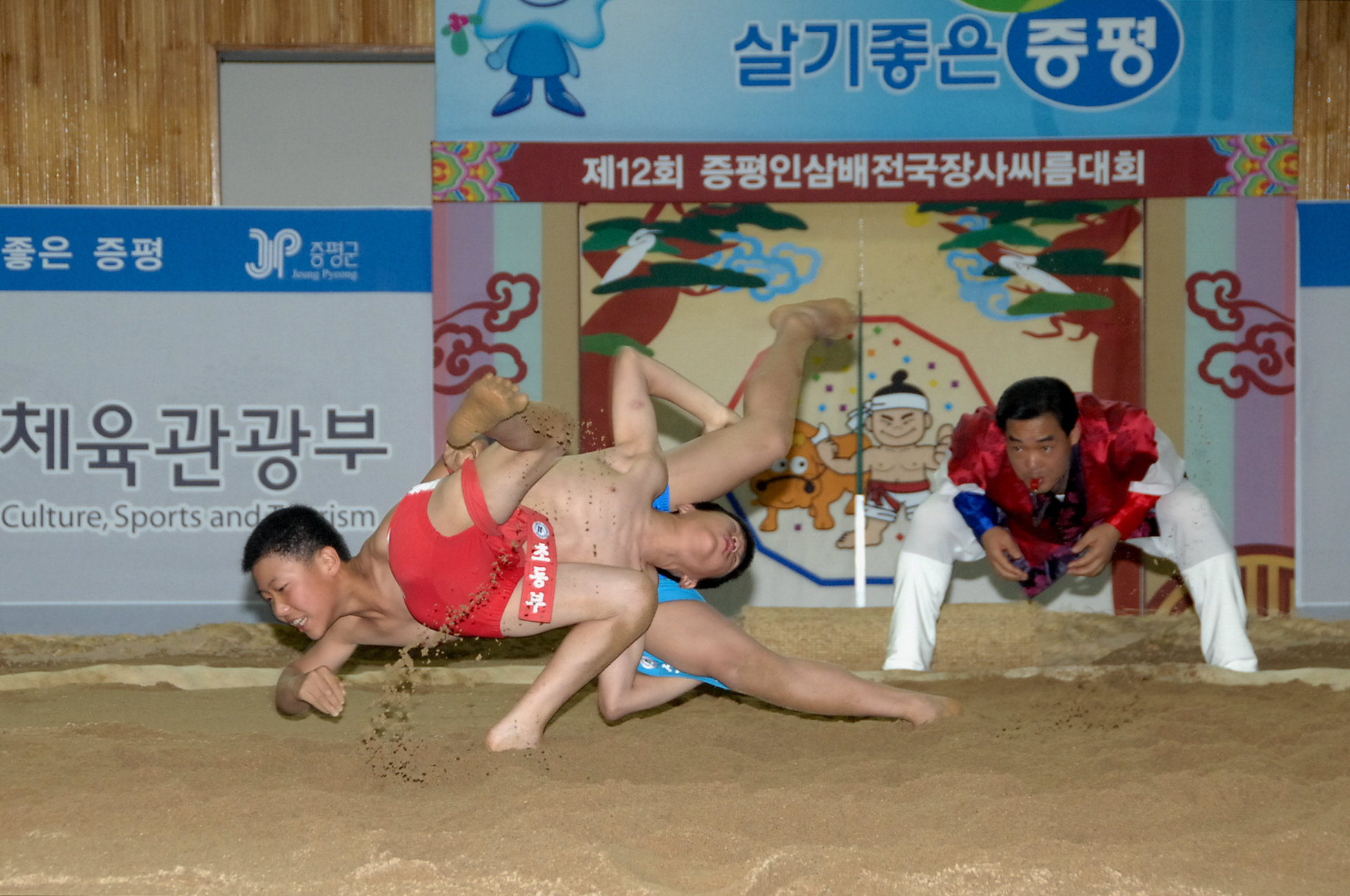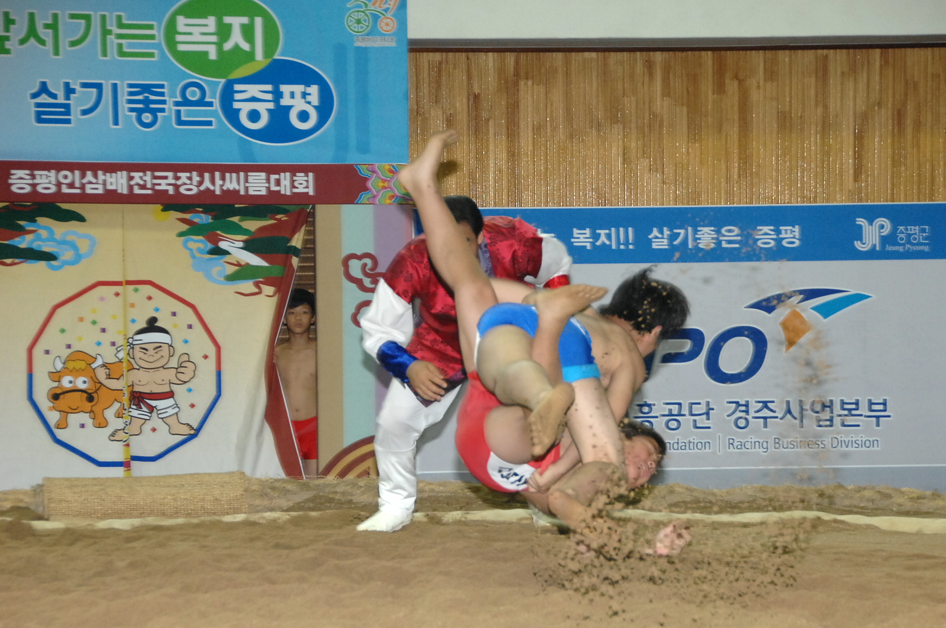사진 1 은 3대 3 상황에서 인천광역시 용일초 김민성선수가 충남 기지초등학교 송인범선수를 배지기를 이겨 초등부 단체전 8강에 진출했으며, 사진 2는 용일초 조옥환선수의 뒤집기 경기 모습