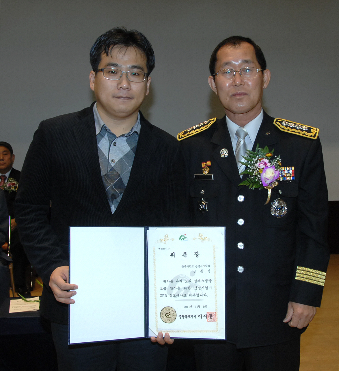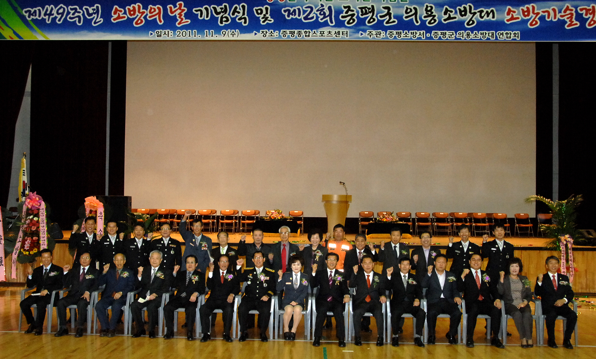 증평소방서(서장 유인걸)와 증평군의용소방대연합회(회장 이재천)는 9일 오전 10시 증평종합스포츠센터에서 홍성열 증평군수, 유인걸 소방서장을 비롯한 소방관계자 및 내빈을 비롯해 지역주민 등 400여명이 참석한 가운데 ‘제49주년 소방의 날 기념식’ 및 ‘소방기술경연대회’를 개최했다.