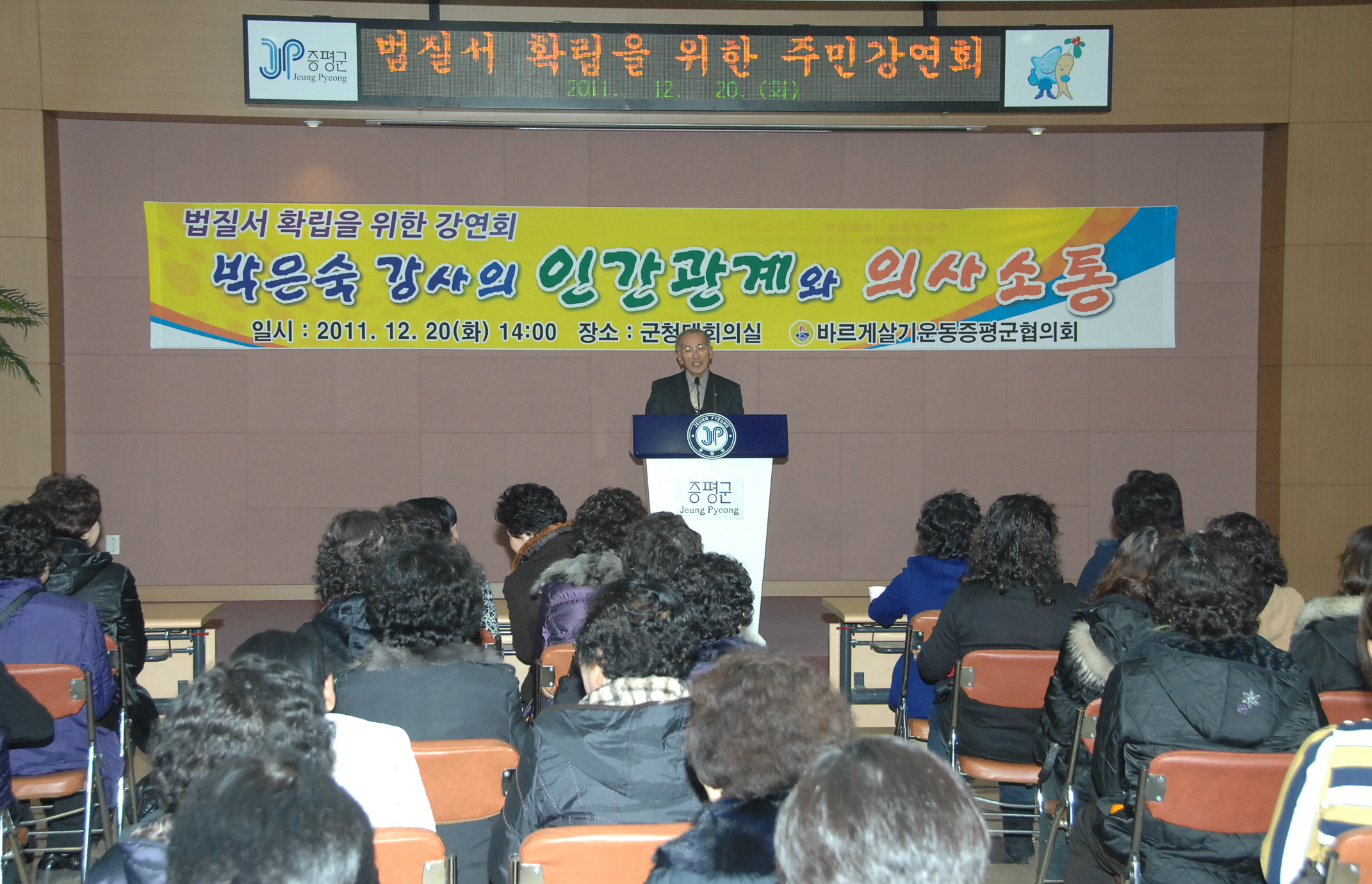 바르게살기운동 증평군협의회(회장 변종림)는 20일 오후 2시 군청대회의실에서 회원 및 군민 등 100여명이 참석한 가운데 ‘바르게살기운동 강연회’를 개최하였다.[보도자료실 참조]