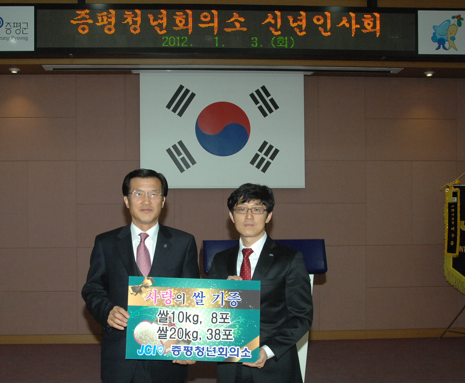 증평청년회의소(회장 이주용)는 임진년 새해를 맞아 증평 지역 각급 기관.단체장이 한자리에 모여 상견례와 덕담을 나누는 ‘2012년 신년인사회’가 3일 오전 11시 군청 대회의실에서 개최하는 한편 사랑의 쌀 840kg을 증평군에 기탁했다.[보도자료실 참조]