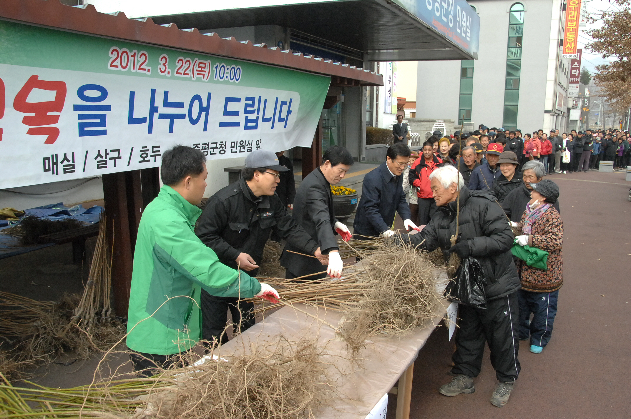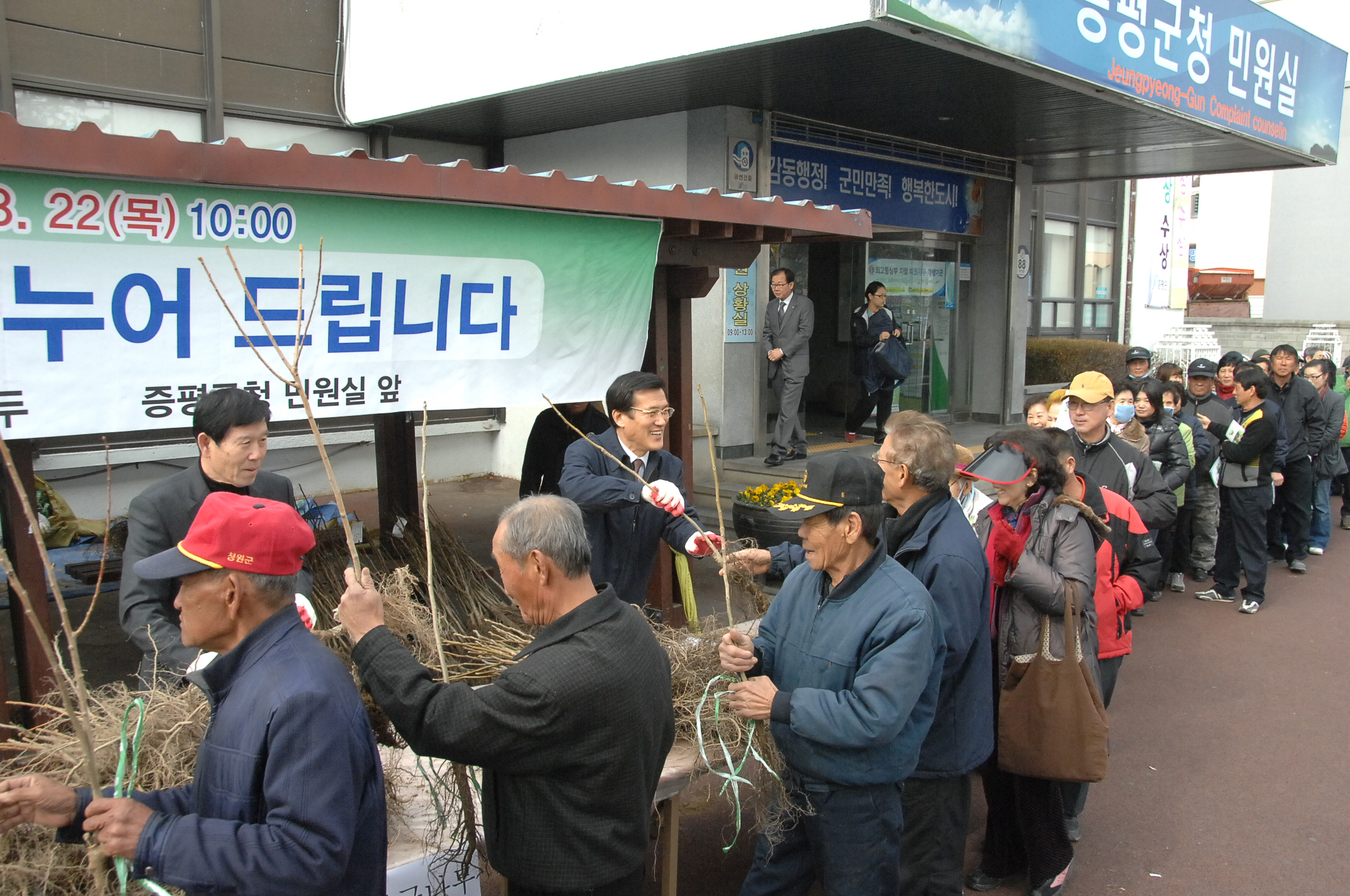 증평군은 봄철 나무심기로 저탄소 녹색성장 분위기를 확산시키기 위해 22일 오전 10시 군청 민원실 앞에서 나무 나누기 행사를 전개했다. [보도자료실 참조]
