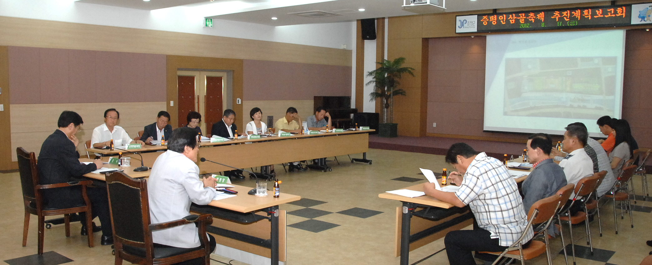 증평군은 17일 오후 2시 군청 대회의실에서 홍성열 증평군수, 최건성 문화원장을 비롯한 관련 기관·단체장과 관계 공무원 등 60여명이 참석한 가운데 ‘증평 인삼골축제’의 차질 없는 준비를 위한 축제 추진상황 보고회를 개최했다. [보도자료실 참조]