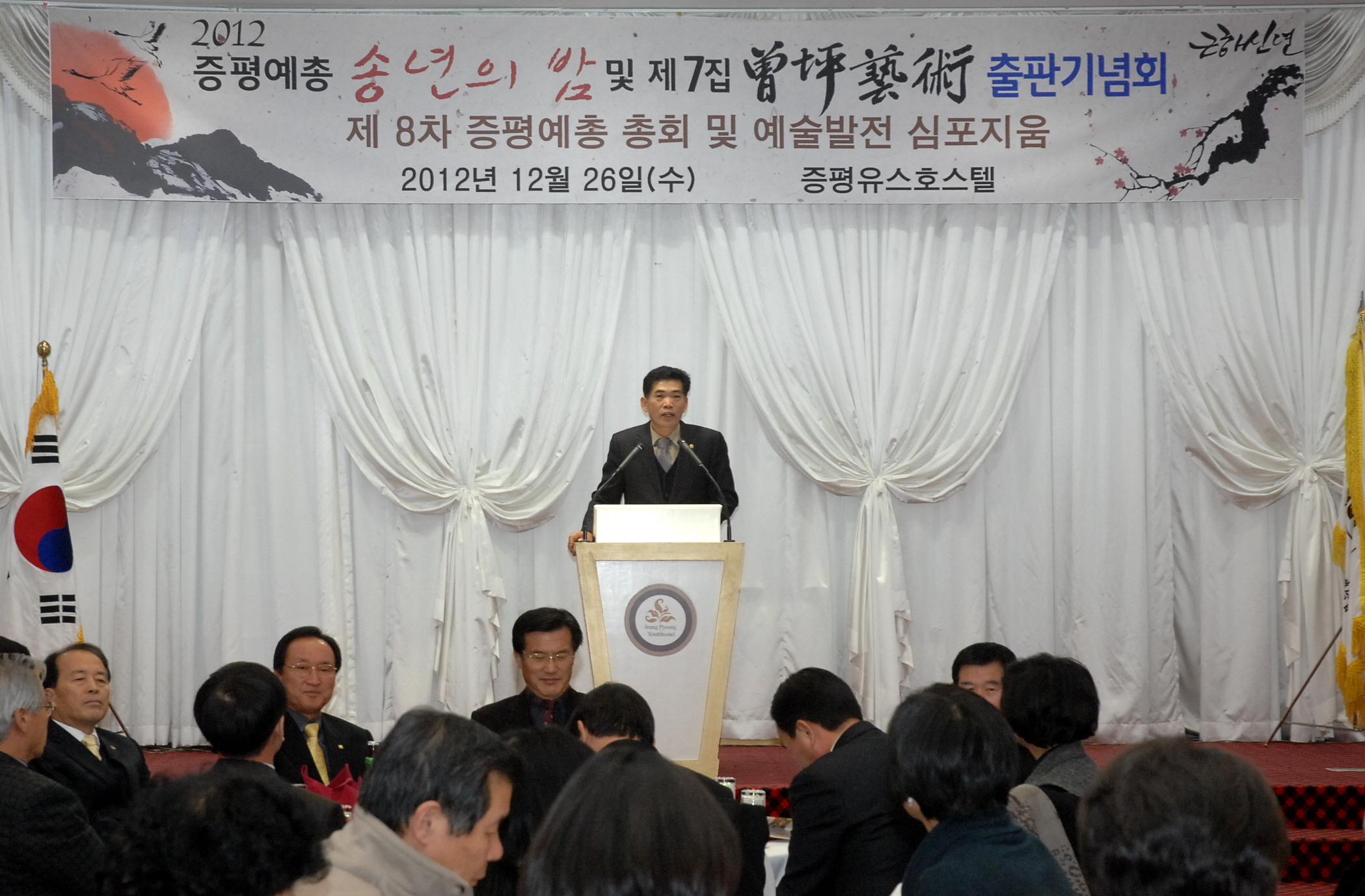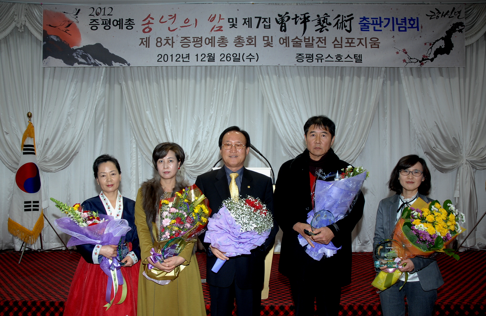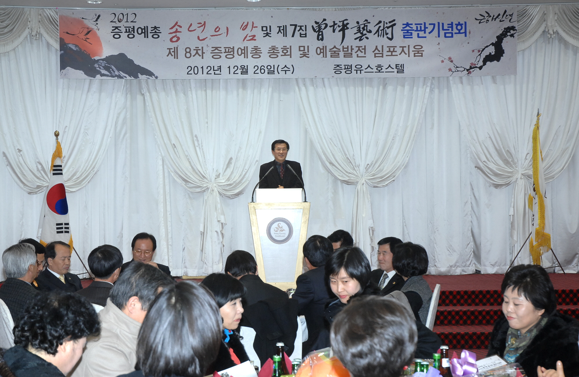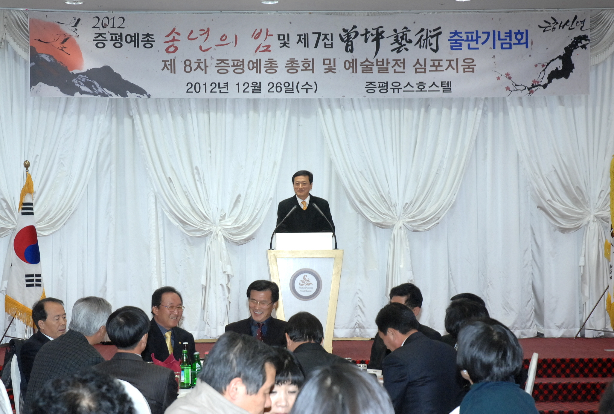 증평예총(회장 김장응)은 지난 26일 오후6시 증평읍 연탄리 증평유스호스텔에서 홍성열군수, 박석규군의장, 김학봉 괴산증평교육장, 김봉회도의원, 문상욱충북도예총회장을 비롯한 기관단체장과 예술인 등 약150여명이 참석한 가운데 2012 증평예총 송년의 밤 및 제7집 증평예술 출판기념회 그리고 제8차 증평예총 총회 및 예술발전 심포지움을 가졌다.