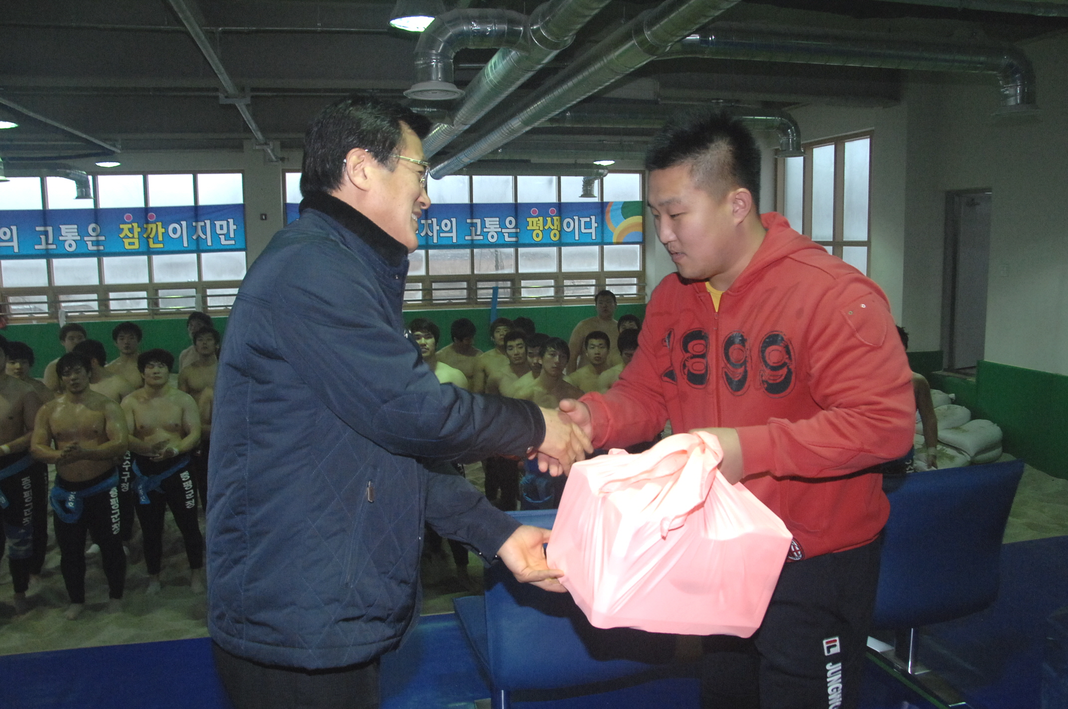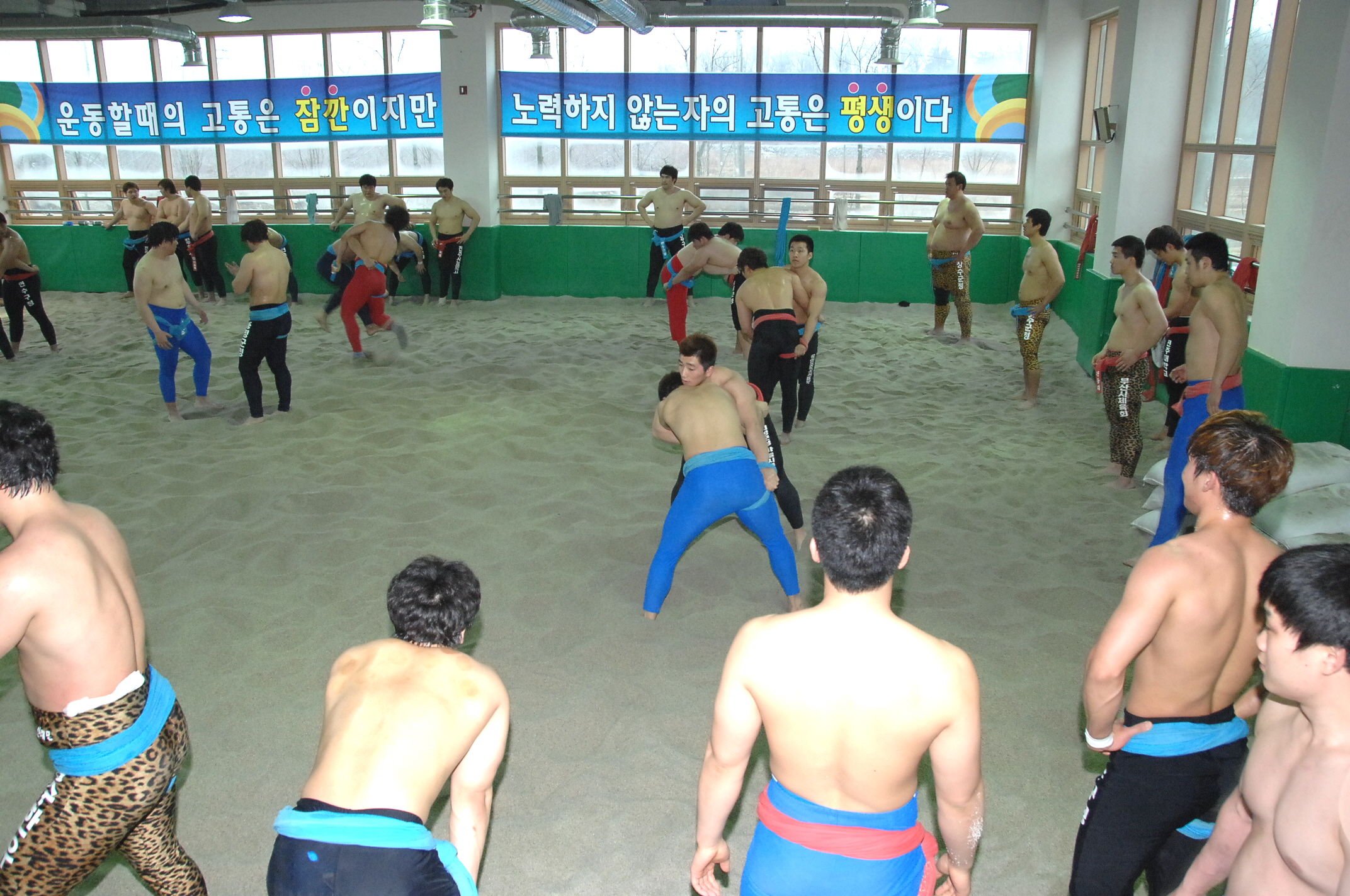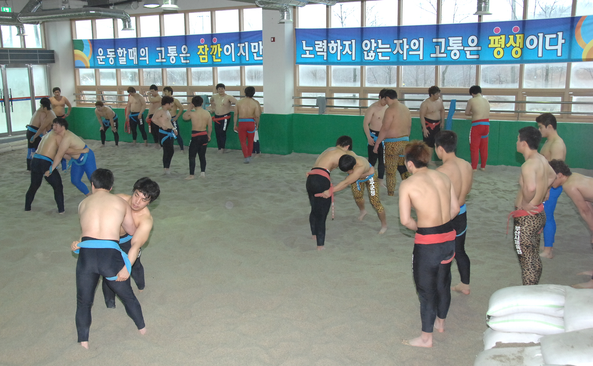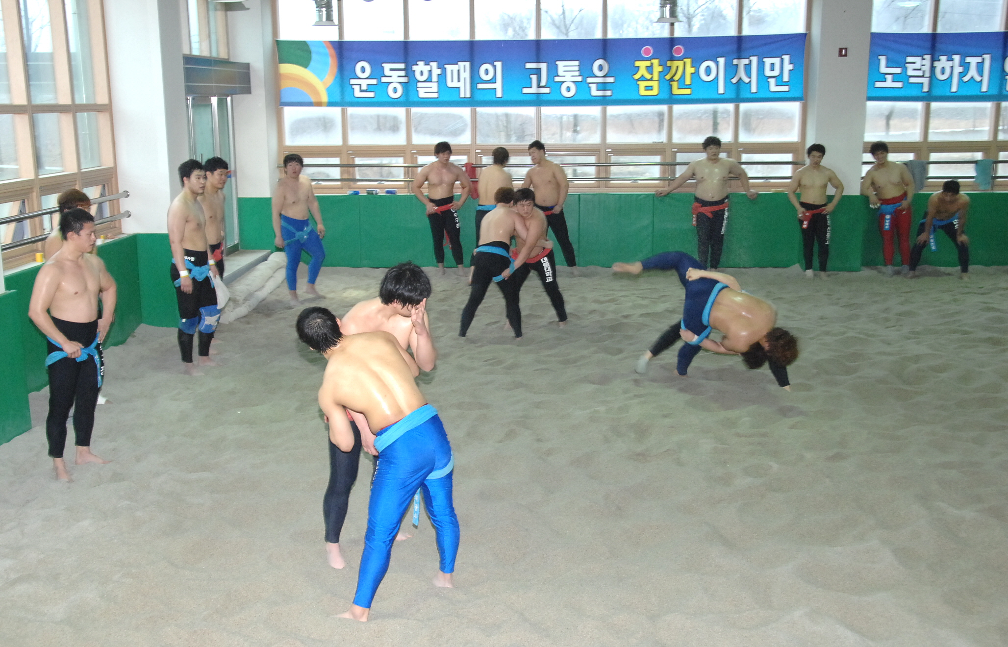 증평군 증평읍 송산리에 위치한 증평군씨름장이 동절기 전지훈련팀들의 씨름열기로 한 겨울 추위를 녹이고 있다.[보도자료실 참조]