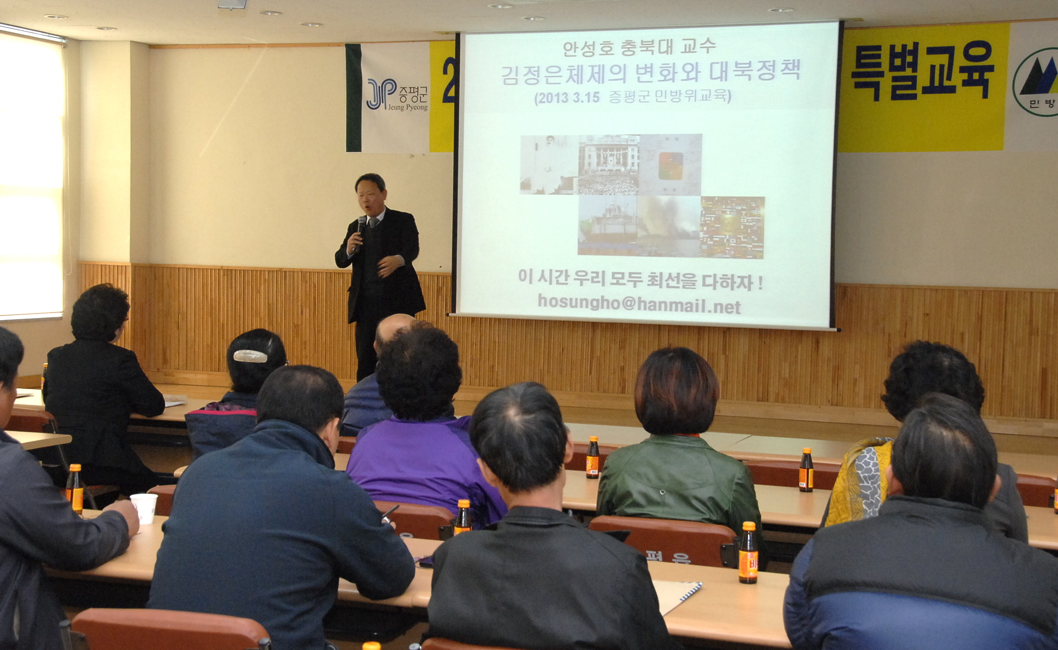 증평군은 15일 오후1시부터 4시간 동안 증평읍사무소 대회의실에서 68명의 민방위대장을 대상으로 특별교육을 실시했다. [보도자료실 참조]