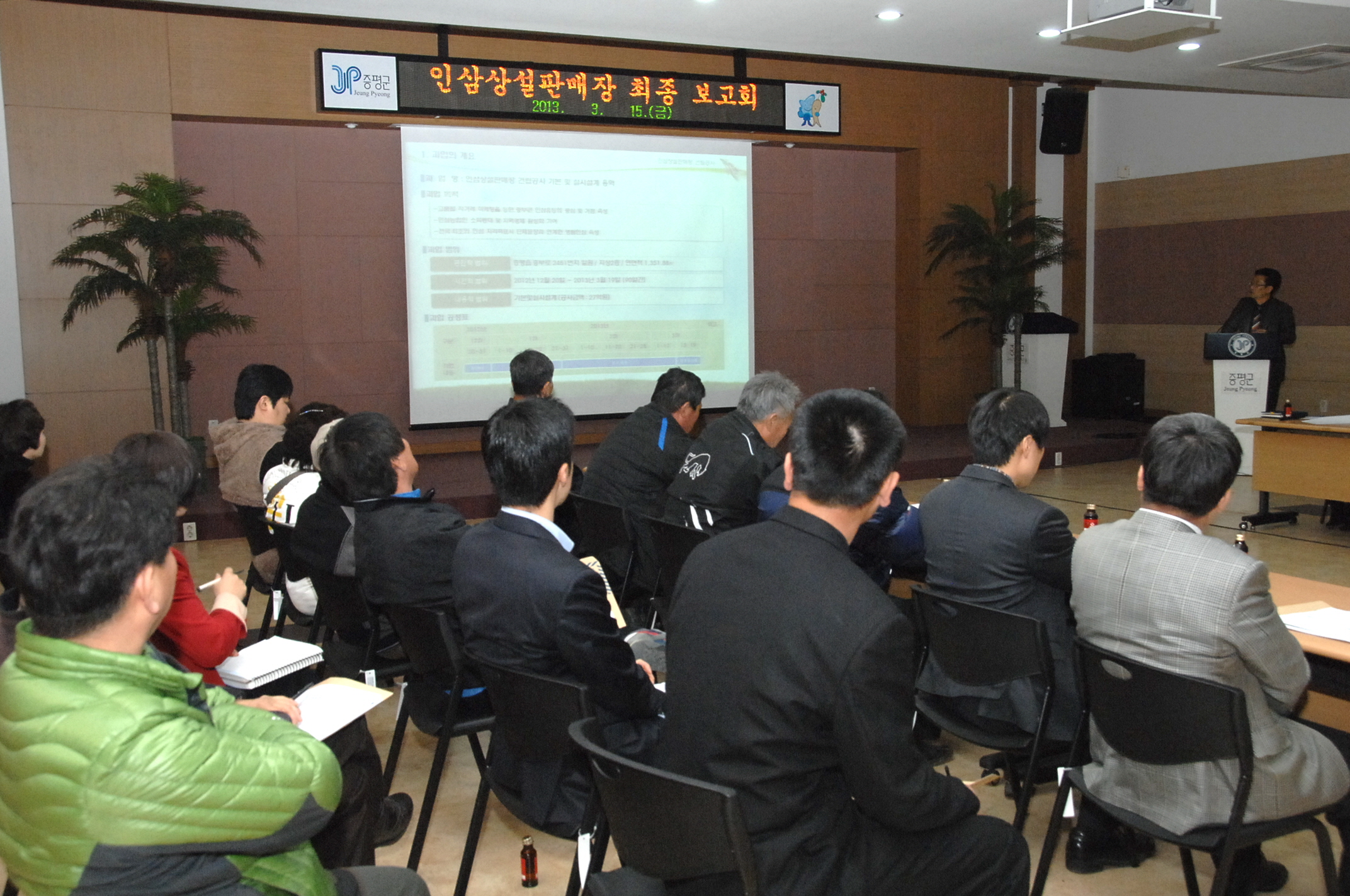 증평군은 15일 오후2시 군청 대회의실에서 인삼농가 및 주민, 입점의향자 등 50여명 참석한 가운데 “인삼상설판매장 건립 기본 및 실시설계용역” 최종보고회를 가졌다. [보도자료실 참조]