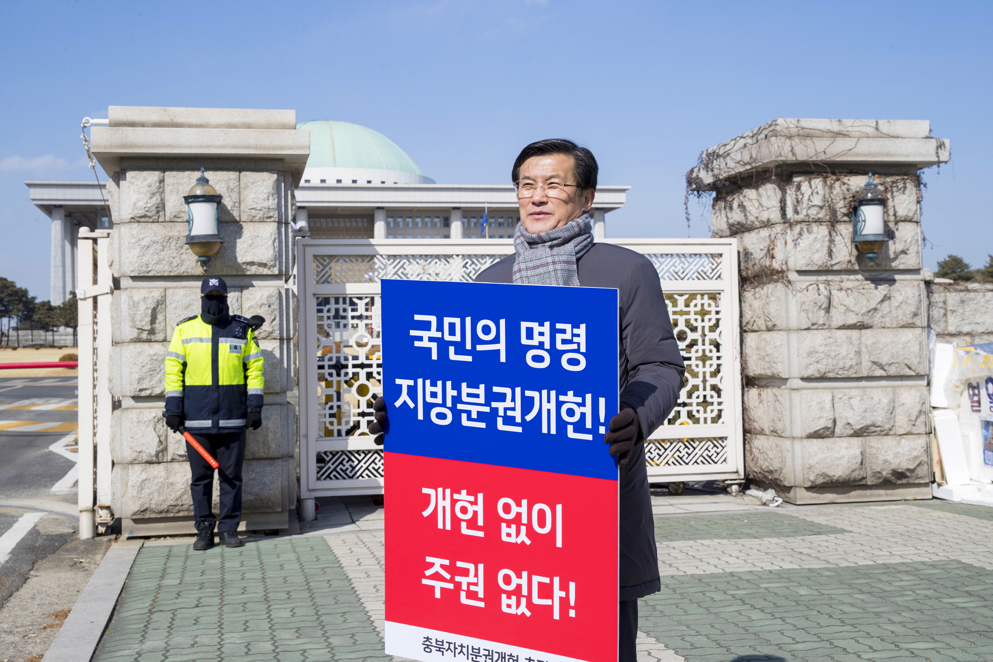 홍성열 증평군수는 2월 12일 임시국회가 개회중인 국회의사당 정문에서‘국민의 명령 지방분권 개헌’,‘개헌 없이 주권 없다’는 문구가 적힌 팻말을 들고 1인 시위를 벌였다.(보도자료실 참조)