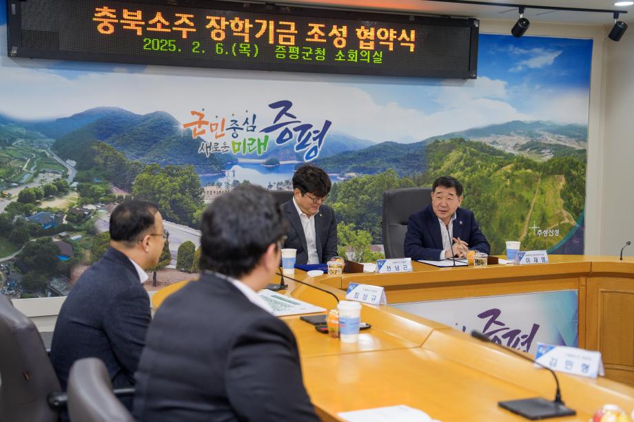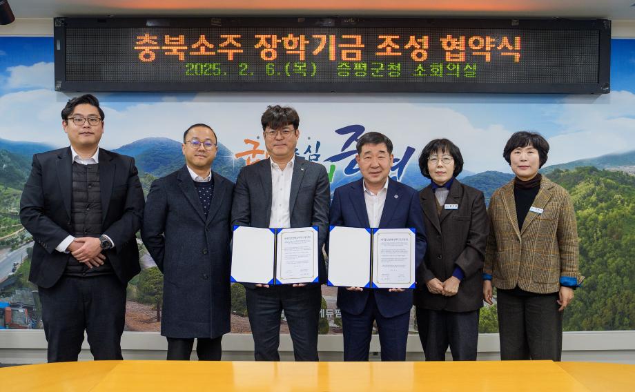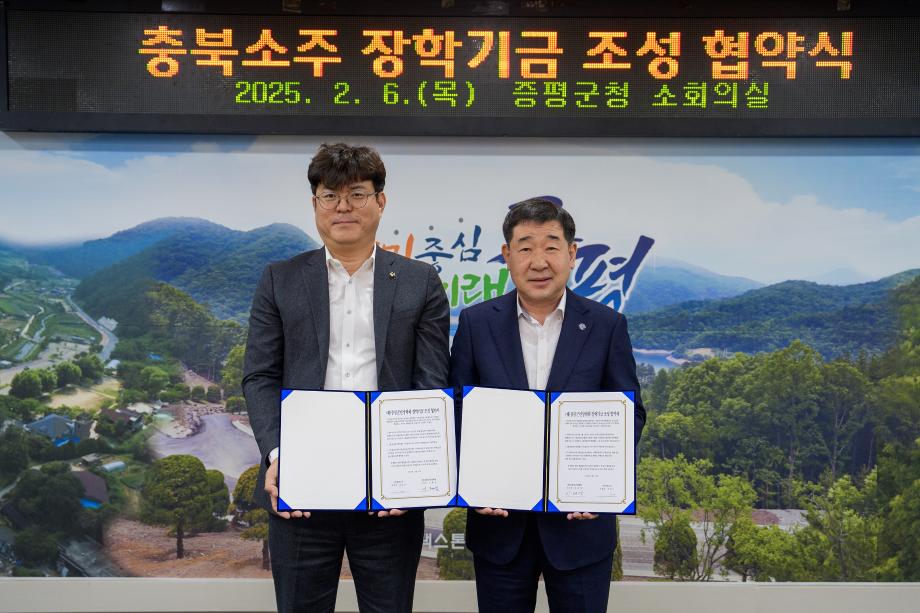 (재)증평군민장학회(이사장 이재영)와 ㈜충북소주(충북지점장 전남근)가 6일 증평군청 소회의실에서 지역 인재 양성을 위한 장학기금 조성협약을 체결했다.