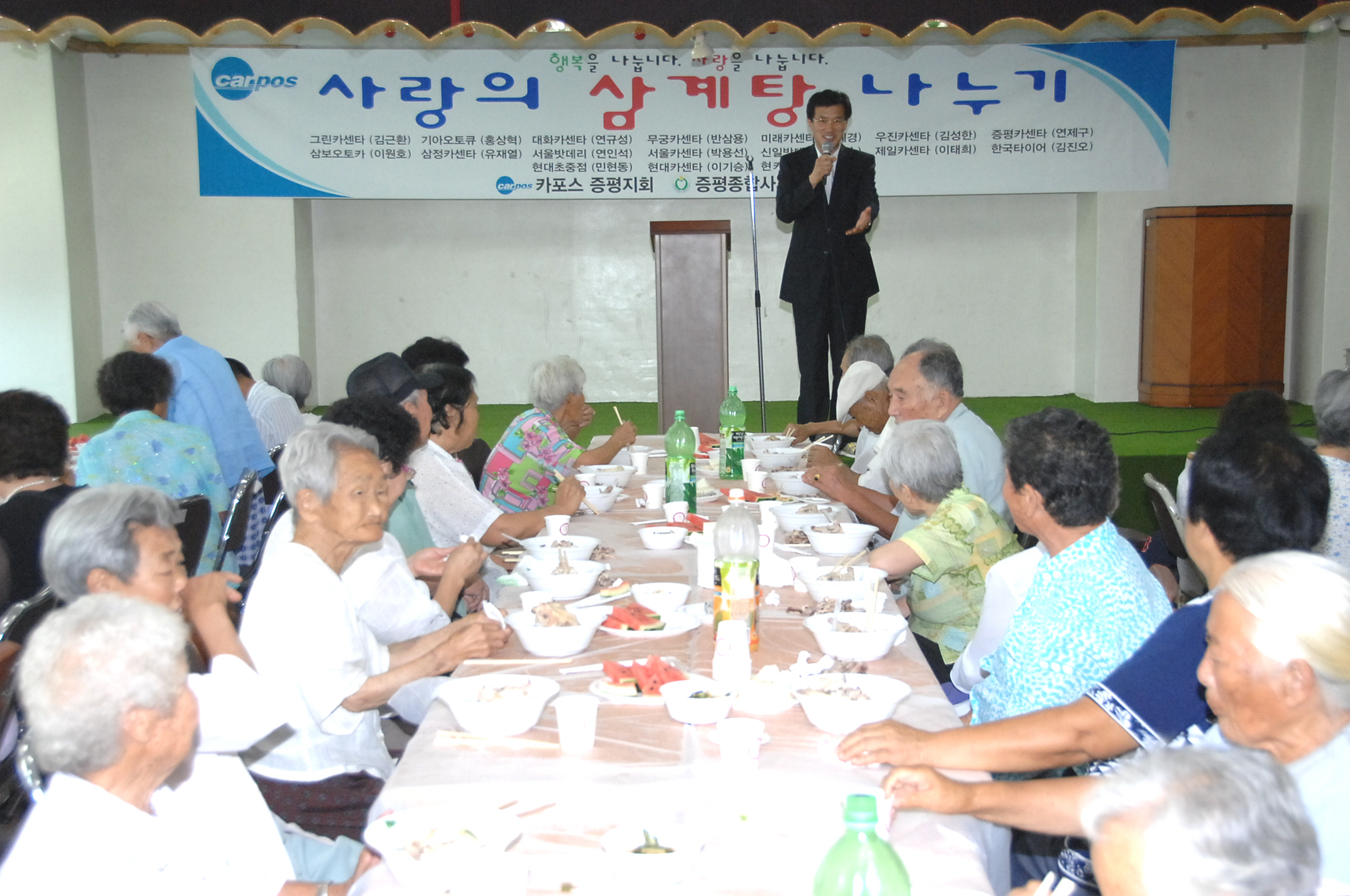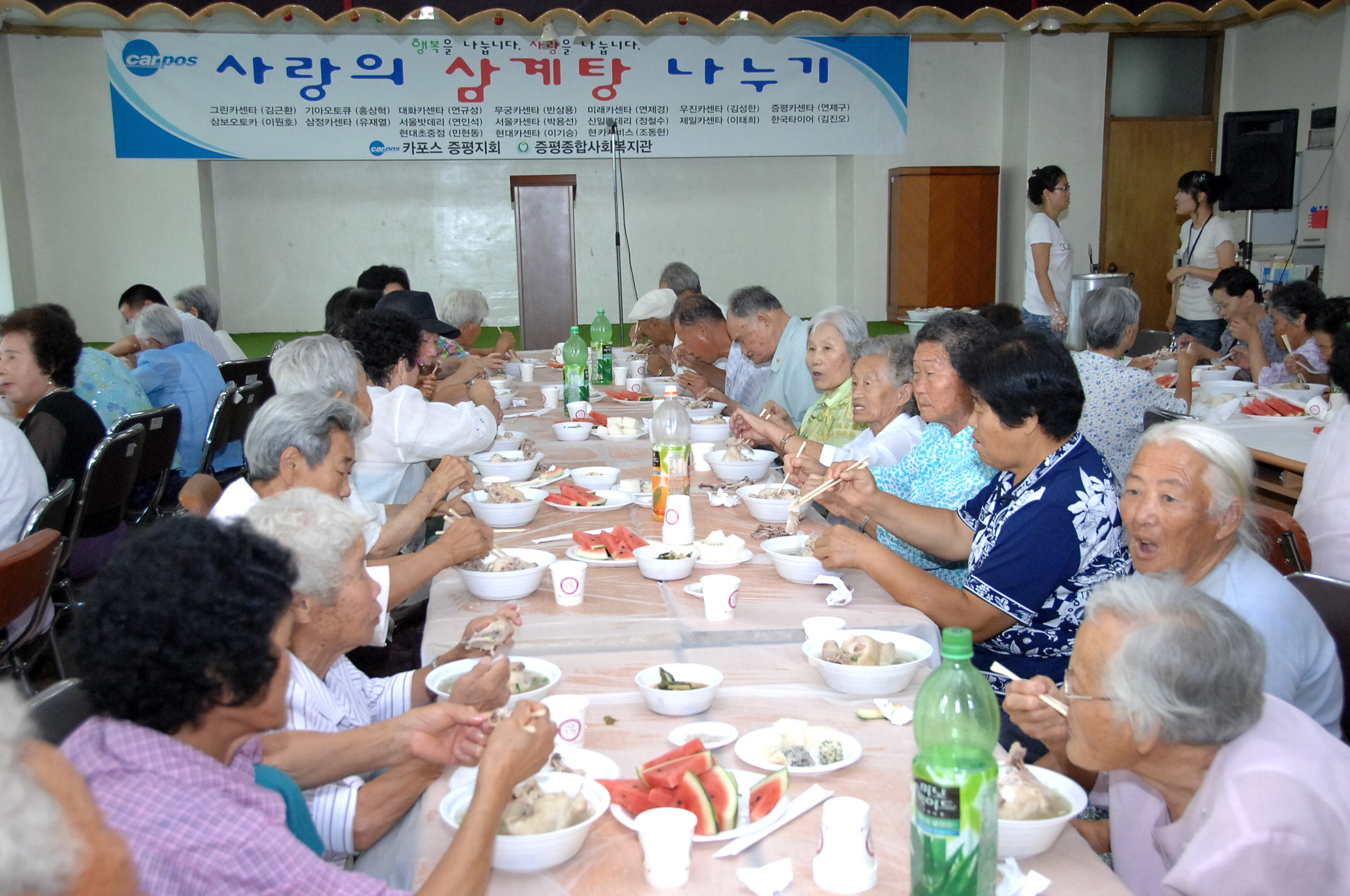 카포스 증평지회(지회장.홍상혁)에서는 29일 중복날을 맞아 증평종합사회복지관에서 저소득 노인 100명에게 건강한 여름을 나시라며 사랑의 삼계탕을 함께 나누었다.[보도자료실 참조]