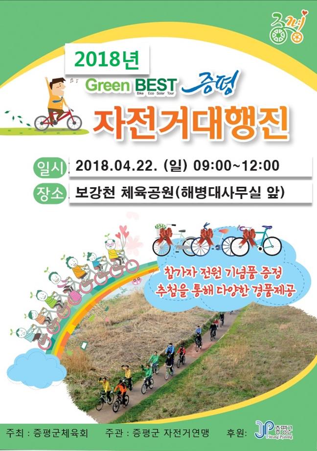 증평군은 4월의 봄을 맞아 오는 22일 오전 9시 보강천체육공원 일원에서‘2018 Green-BEST 증평 자전거대행진’을 개최한다.