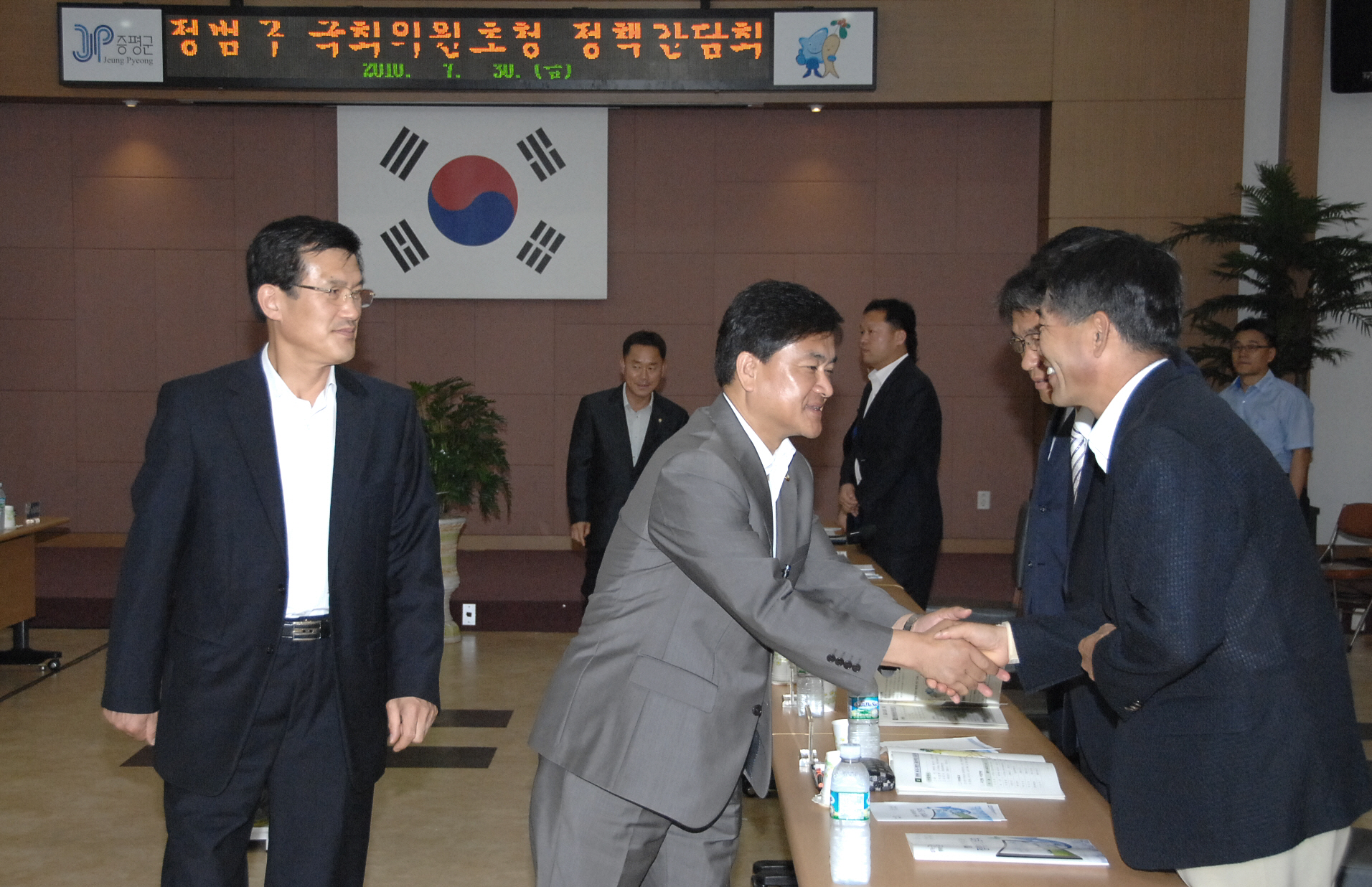 증평군은 30일 홍성열 군수, 김봉회도의원, 김재룡군의장을 비롯한 간부공무원과 군의원이 참석한 가운데 정범구 국회의원과의 정책협의 간담회를 개최했다.[보도자료실 참조]