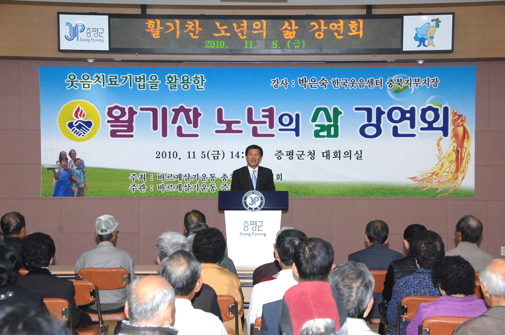 바르게살기운동 증평군협의회(회장 변종림) 주관하고 증평군이 후원하는 활기찬 노년의 삶을 위한 강연회가 5일 오후 2시 군청 대회의실에서 회원과 군민 등 200여명이 참석한 가운데 열렸다.[보도자료실 참조]