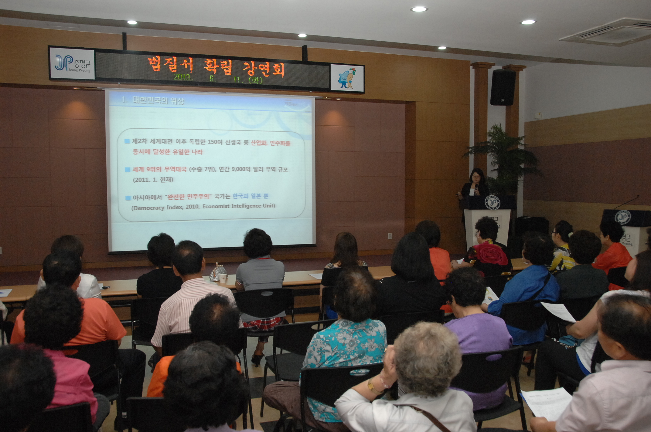 바르게살기운동증평군협의회(회장 이상욱)는 11일 오후 2시에 군청 대회의실에서 바르게살기 회원 및 군민 150여명이 참석한 가운데 ‘2013 바르게살기운동 법질서 확립 특별강연회’를 개최했다. [증평보도자료실 참조]