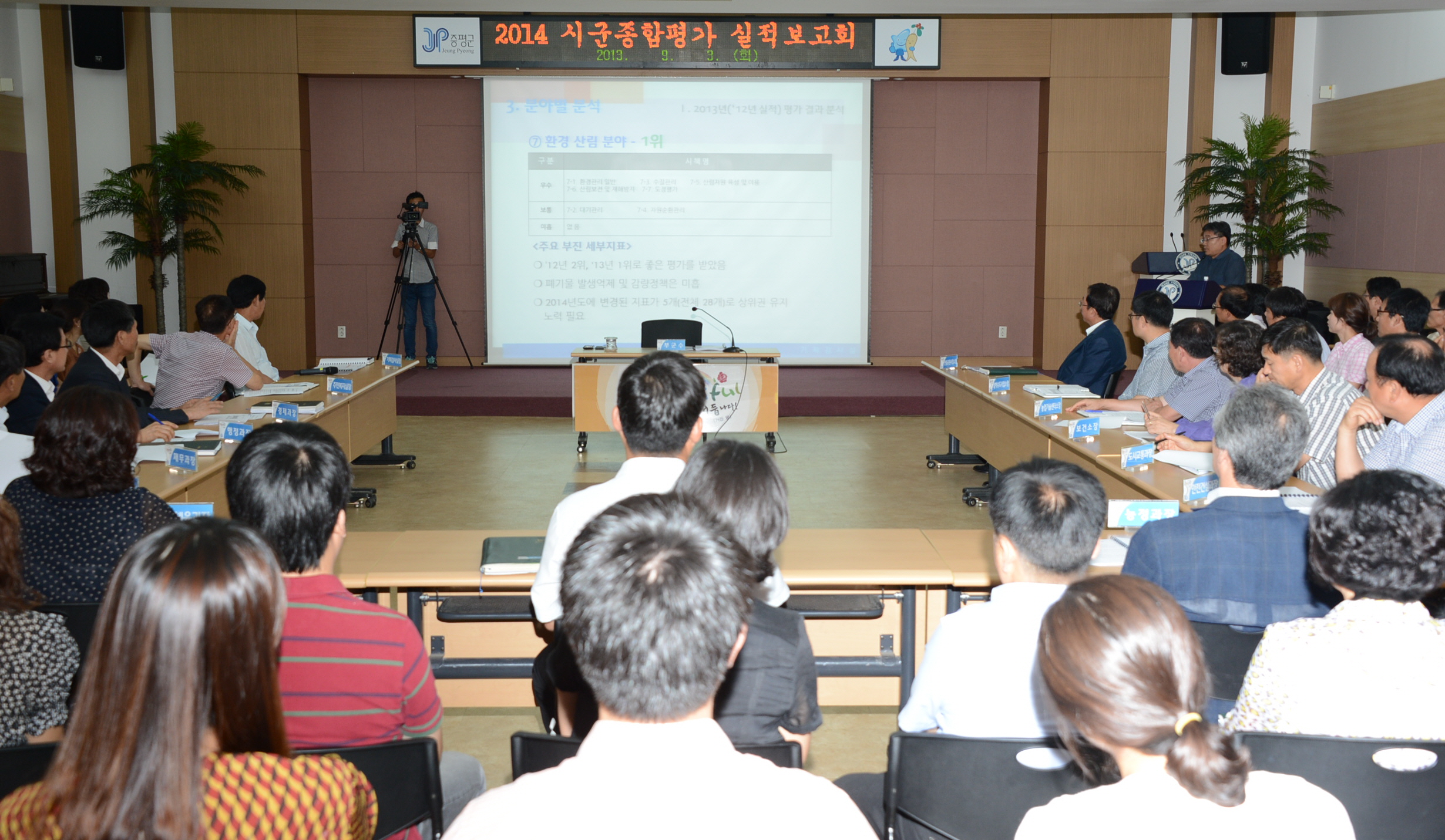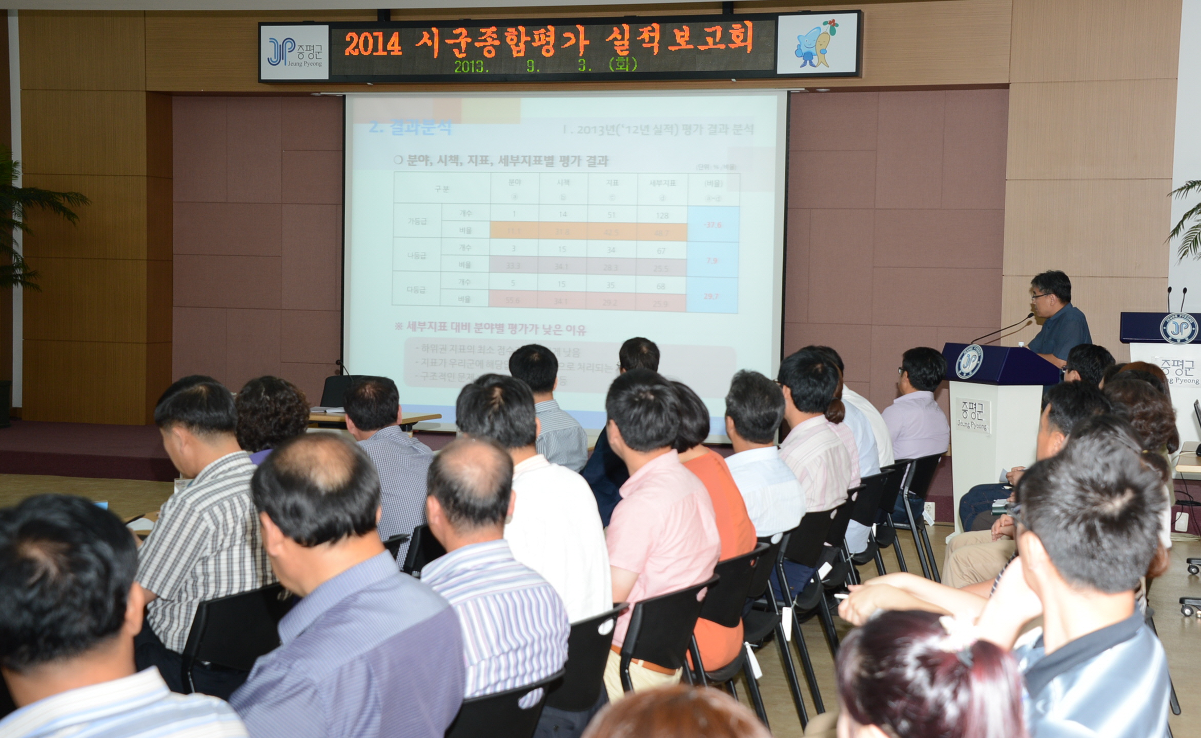 증평군이 2014년(2013년실적) 시군종합평가 대응을 위해 박은상 부군수를 주재로 실·과·소장 및 지표담당자 등 70여명이 참석한 가운데 보고회를 개최했다. [보도자료실 참조]