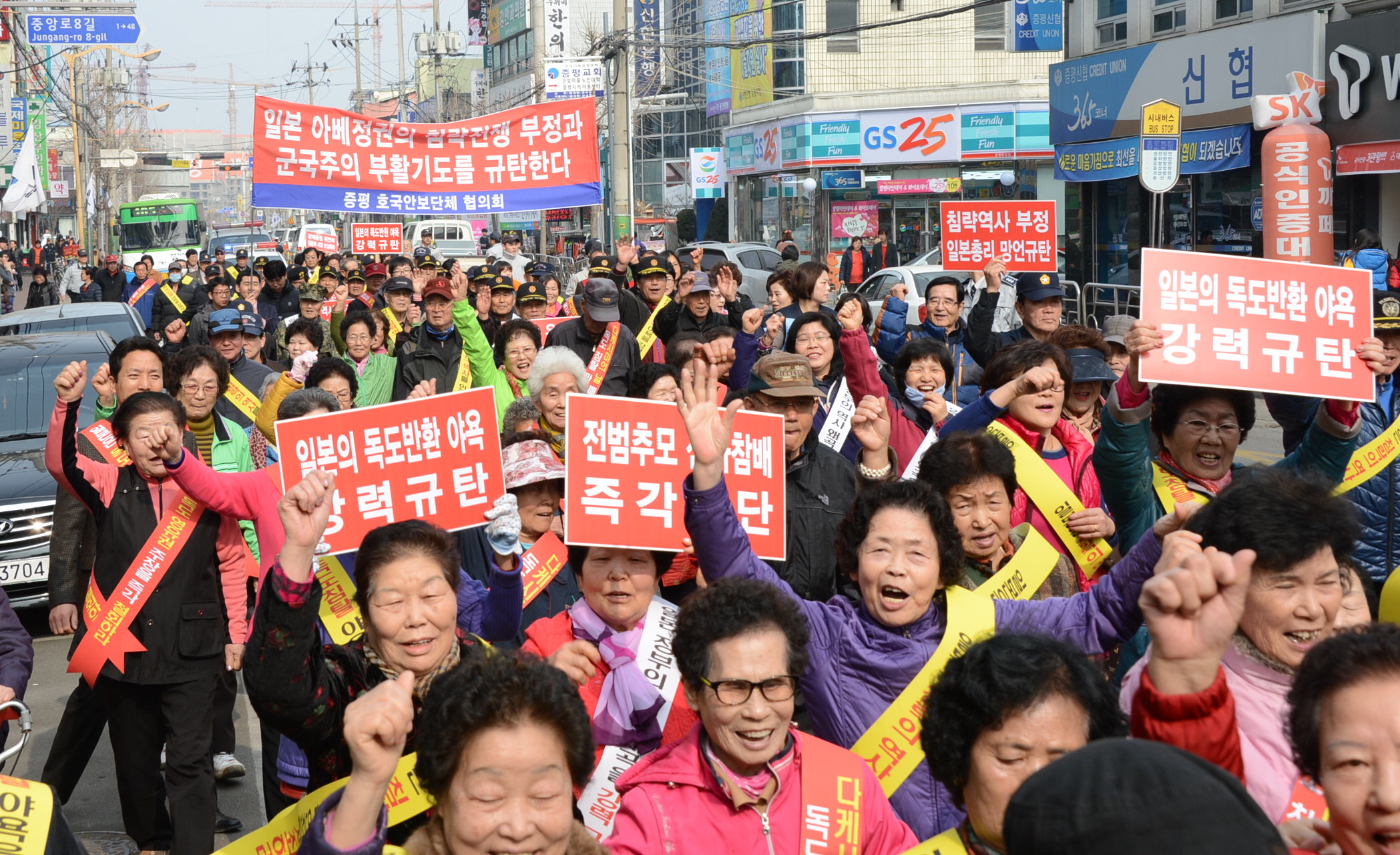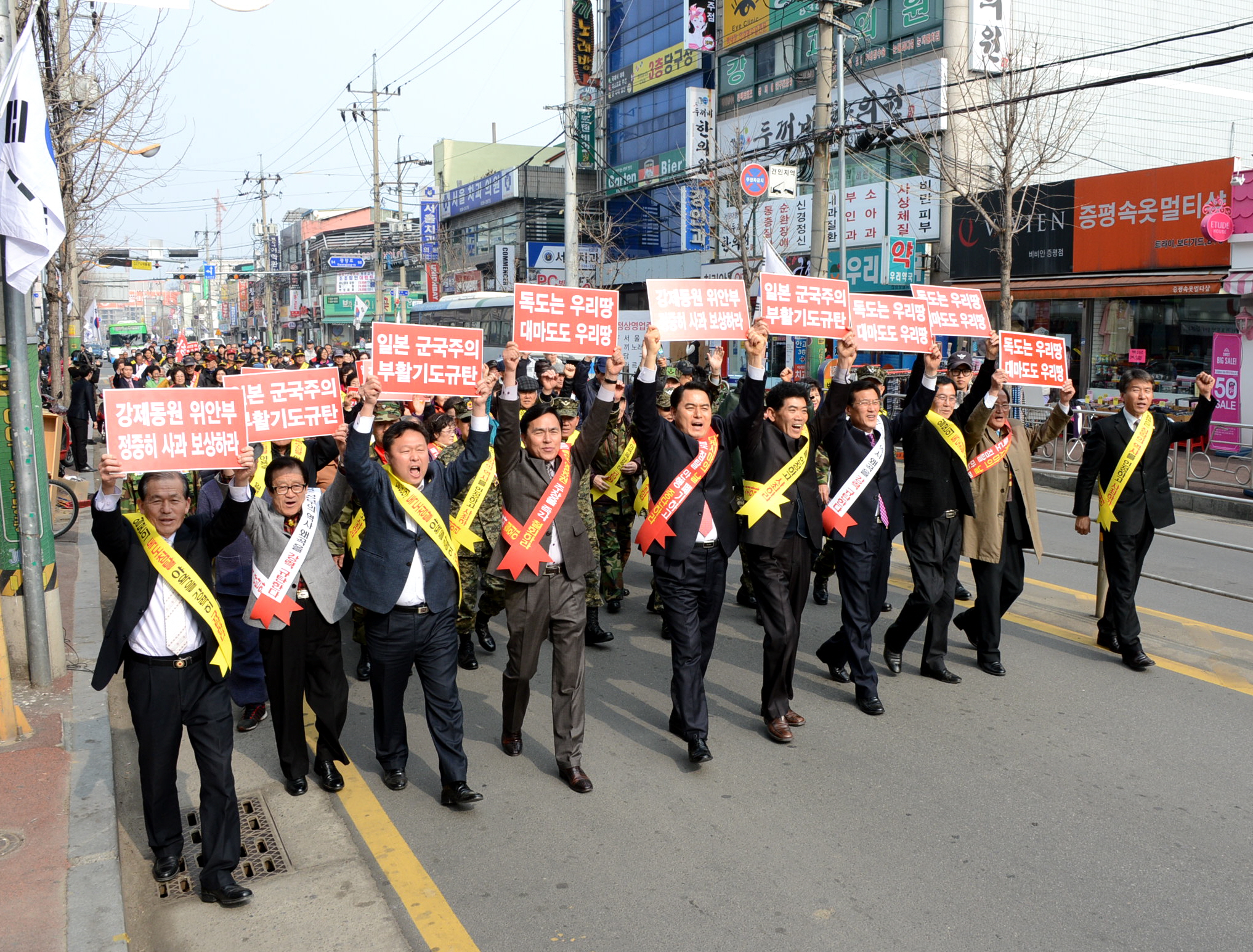 최근 독도영유권 도발 및 야스쿠니 신사참배 동조, 안중근 의사 테러리스트 발언 등 각종 망언과 우경화로 치닫고 있는 아베정부를 규탄하기 위한 대규모집회가 28일 오후2시 증평군호국안보협의회(회장 육재동) 주관으로 회원 1000여명이 참석한 가운데 증평군청 민원실 앞에서 개최됐다. [보도자료실 참조]