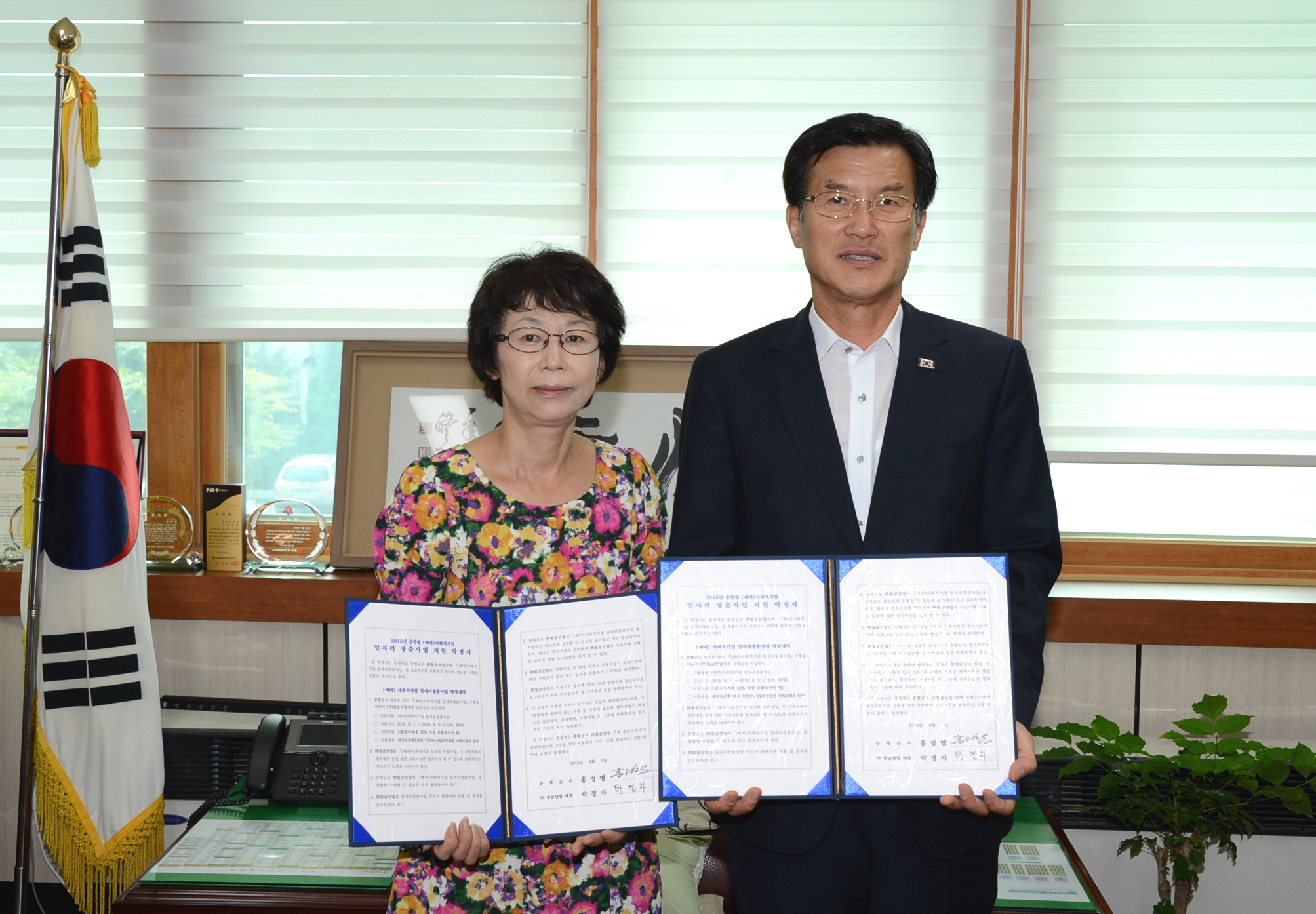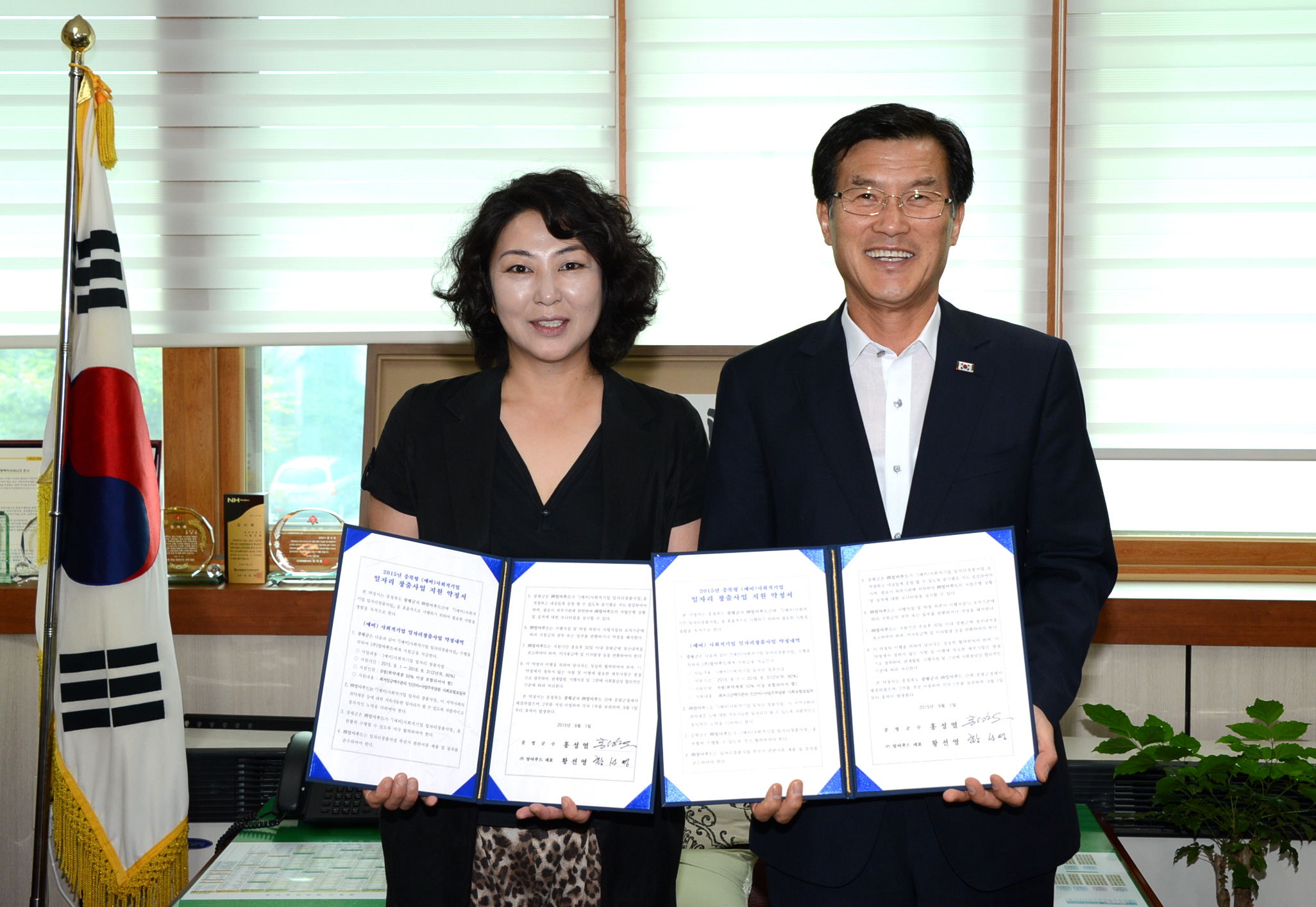 증평군은 3일 오전 9시 30분 홍성열군수를 비롯해 사회적기업인 ㈜엄마푸드(대표 황선영), ㈜ 빛글산업(대표 박경자) 대표 등 5명이 참석한 가운데 군수실에서 일자리창출 약정서를 체결했다.(보도자료실 참조.사진 왼쪽부터 엄마프드. 홍성열군수. 빛글산업)