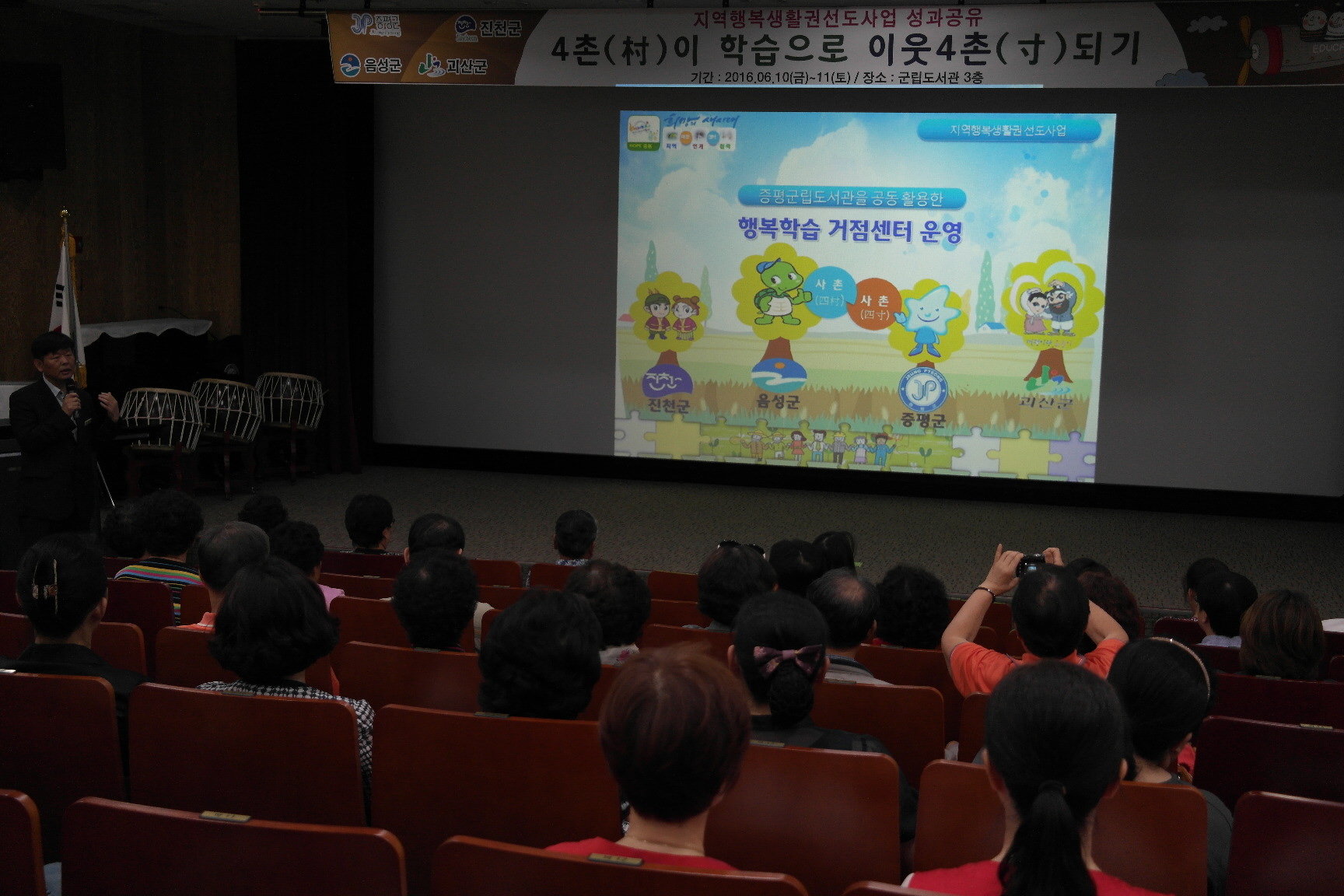 증평군이 진천, 괴산, 음성군과 함께 추진한 지역행복생할권 선도사업‘사촌(四村)-사촌(四寸)행복학습공동체’에 대한 성과 공유회를 가졌다.