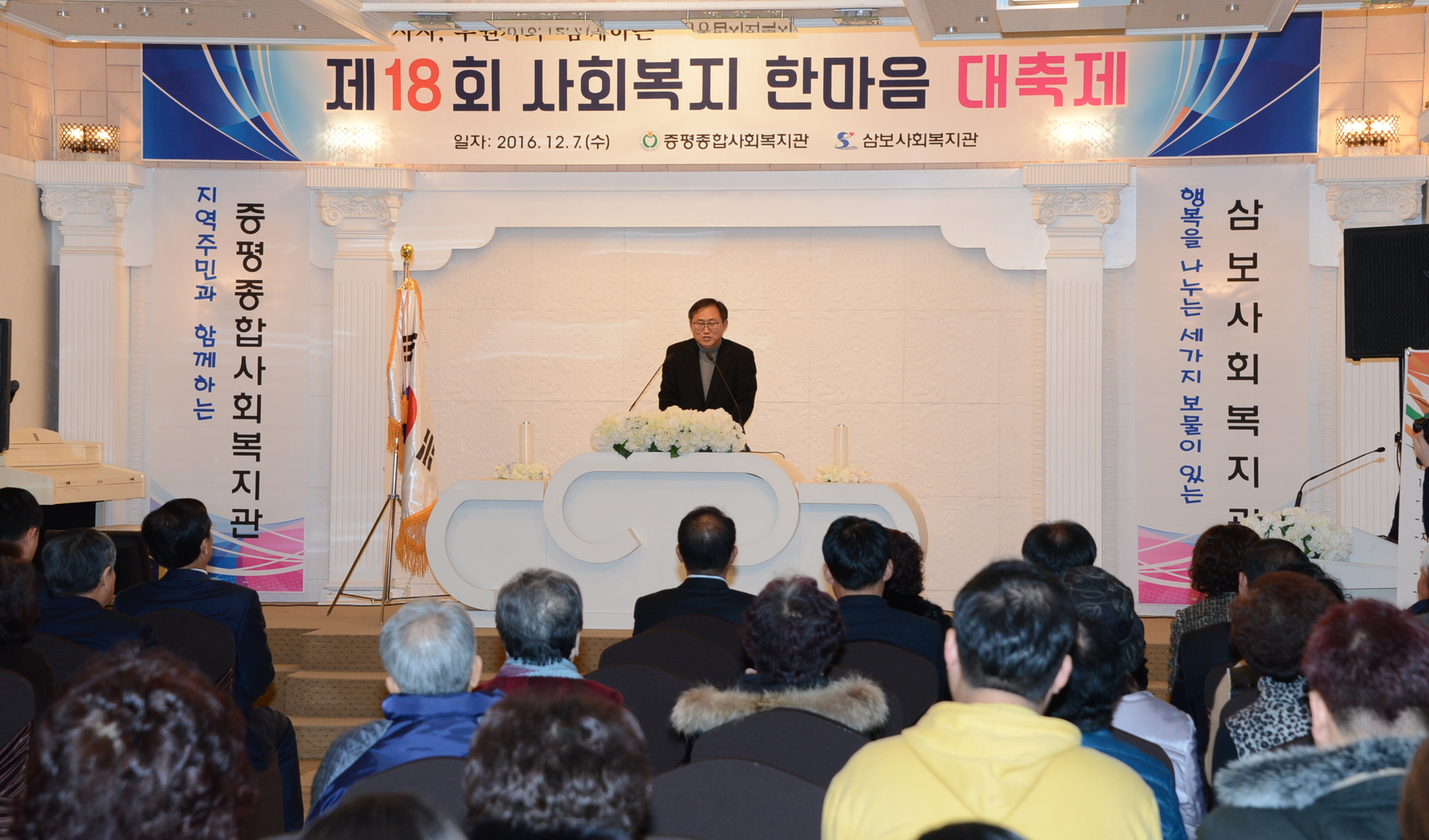 증평종합사회복지관(관장 양천공)과 삼보사회복지관(관장 이광훈)은 7일 증평 디펠리스웨딩홀에서 홍성열군수, 연종석 군의장을 비롯해 자원봉사자와 후원자 등 100여명이 참석한 가운데 제18회 사회복지 한마음대축제 행사를 개최했다.(보도자료실 참조)