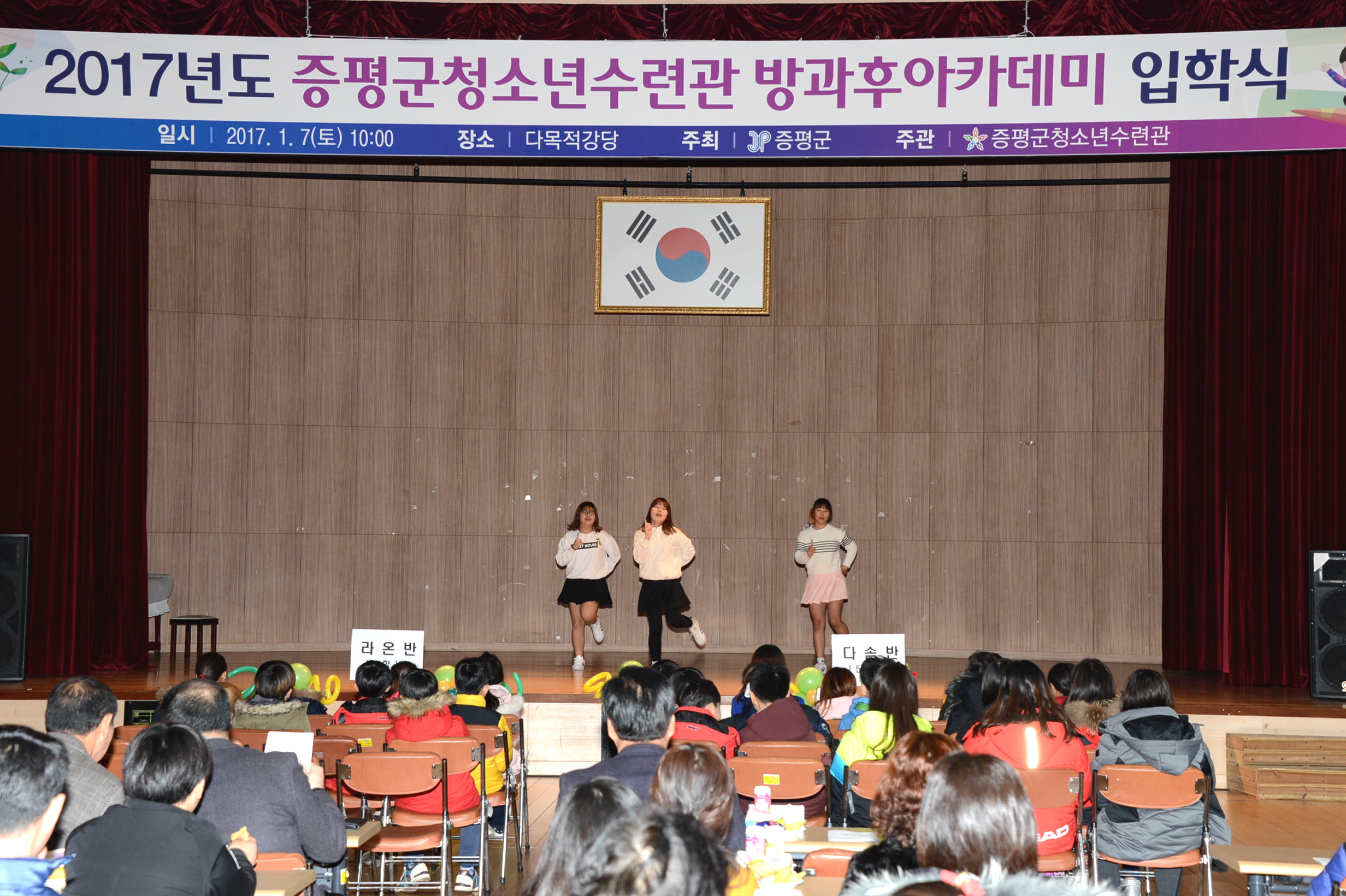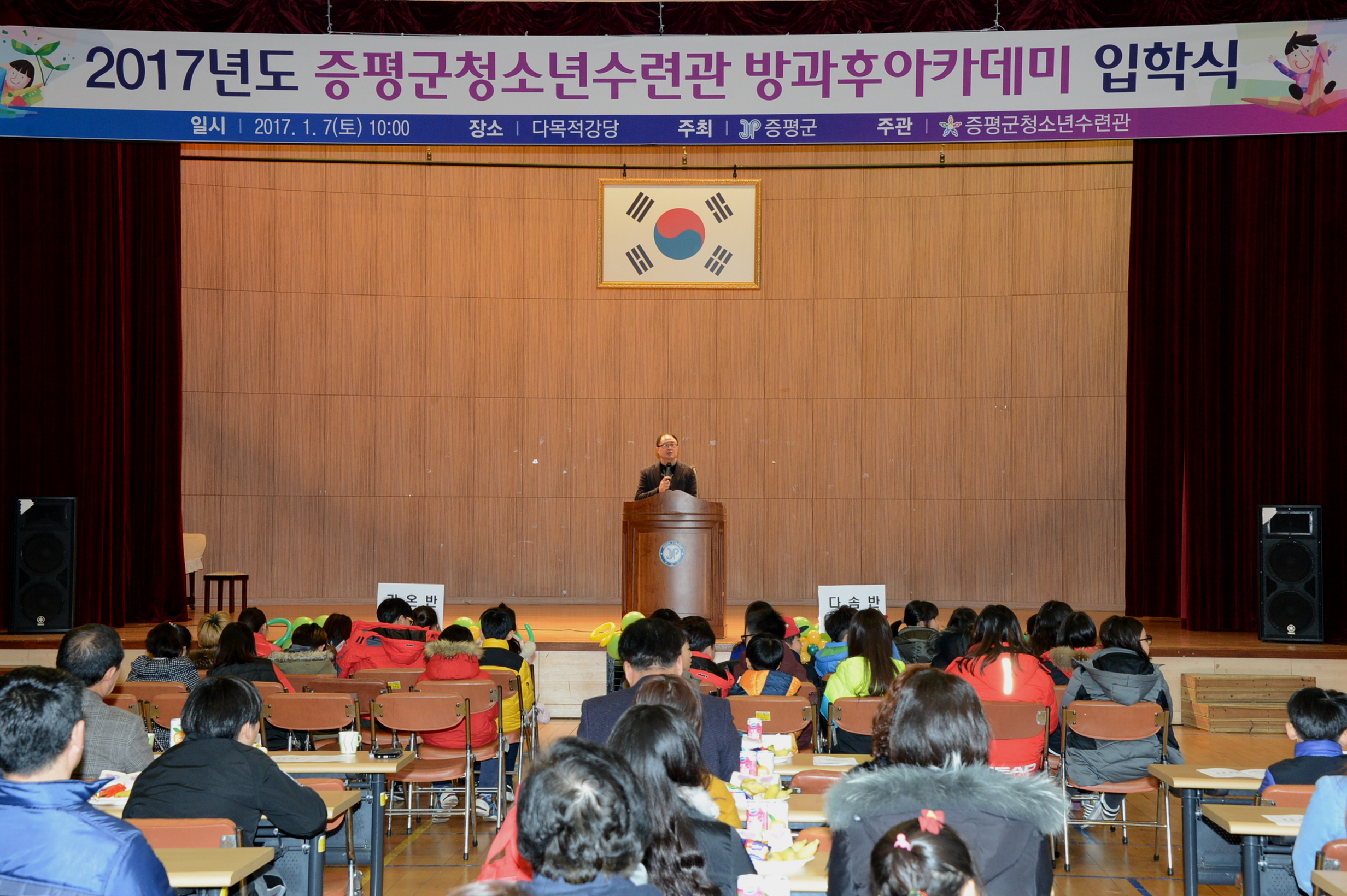 증평군은 7일 증평군 청소년수련관 다목적 강당에서 홍성열군수.김태우 부의장를 비롯해 증평군 청소년수련관 관장, 유관기관 관계자 및 학부형 등 100여명이 참석한 가운데‘2017년도 청소년방과후아카데미 입학식’을 개최 했다.(보도자료실 참조)