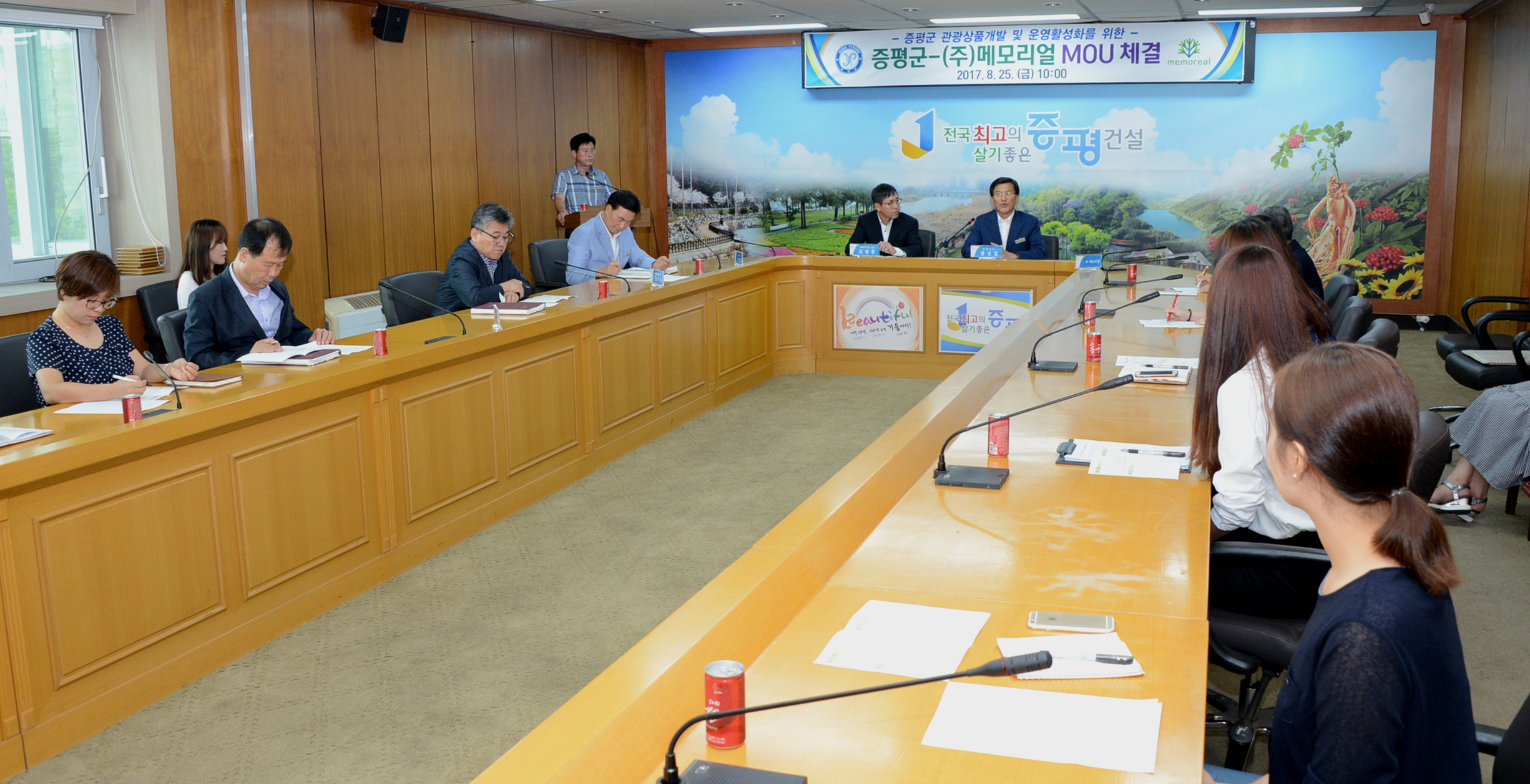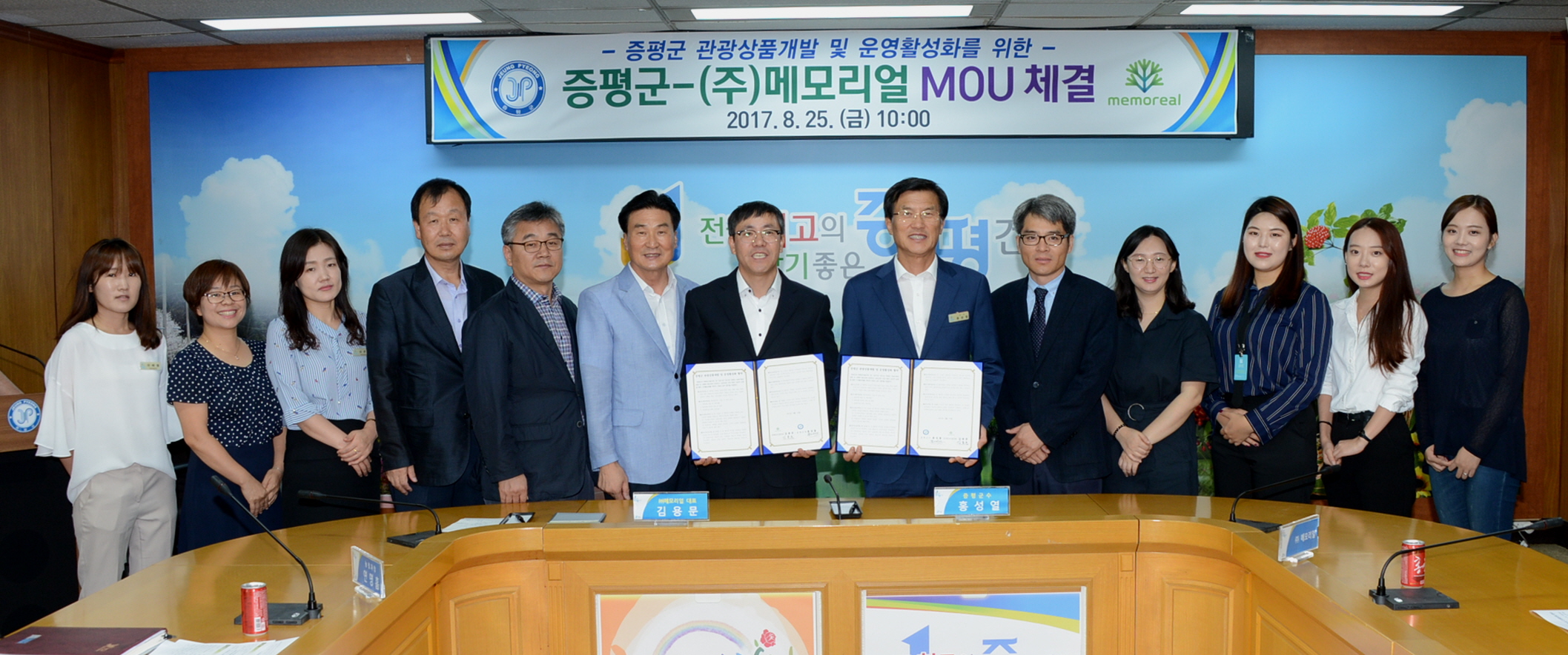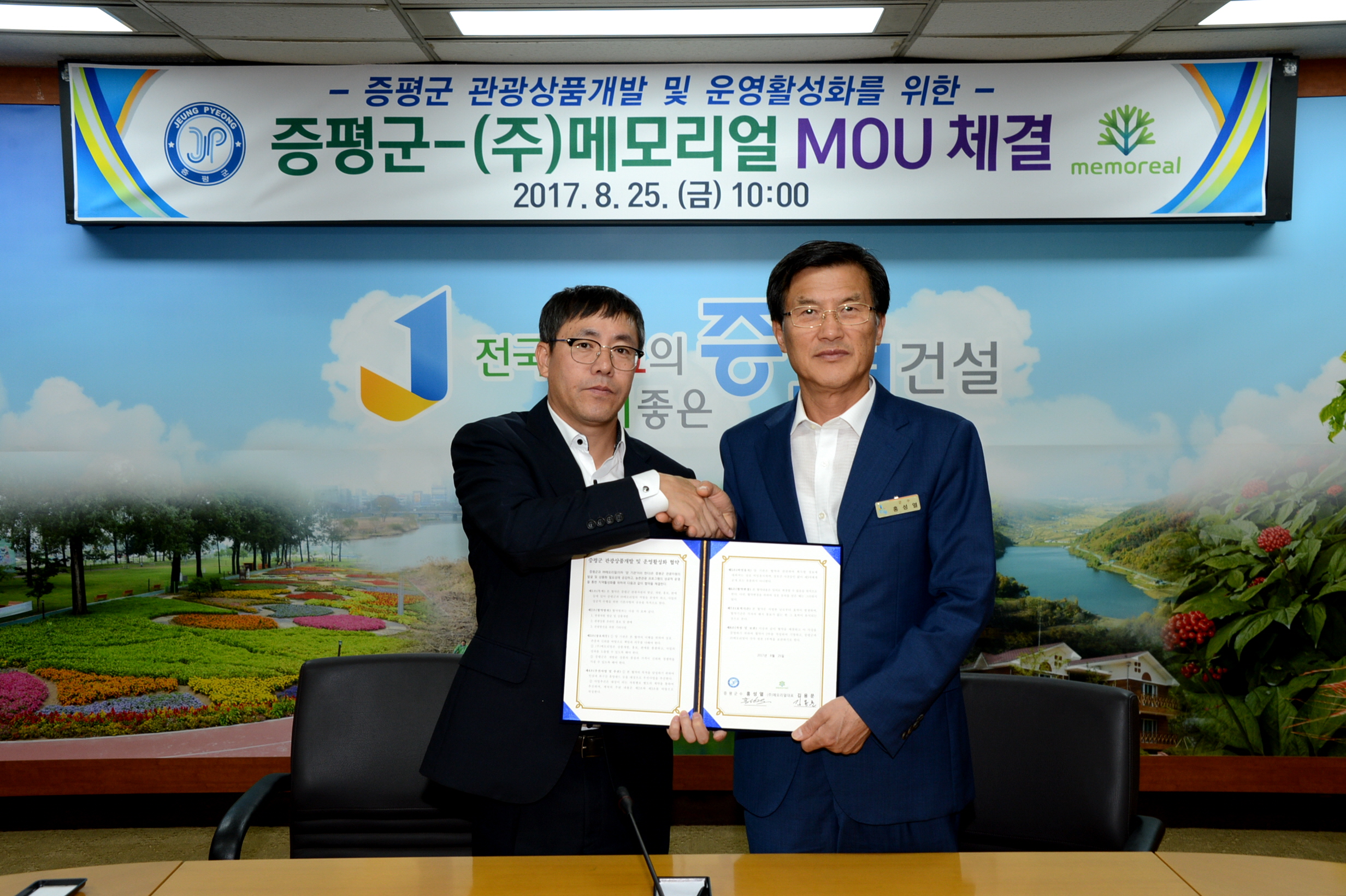 증평군(군수 홍성열)이 농촌관광 전문 업체인 ㈜메모리얼(대표 김용문)과 25일 군청 소회의실에서‘증평군 관광 상품 개발 및 운영활성화를 위한 업무협약(MOU)’을 체결했다.(보도자료실 참조)