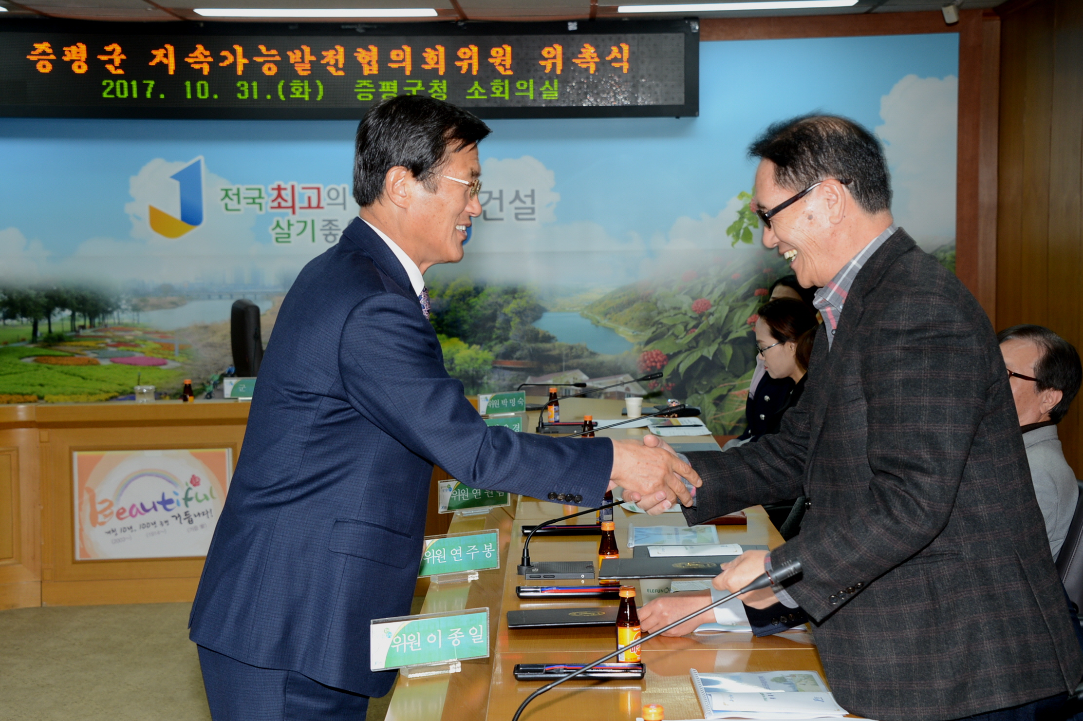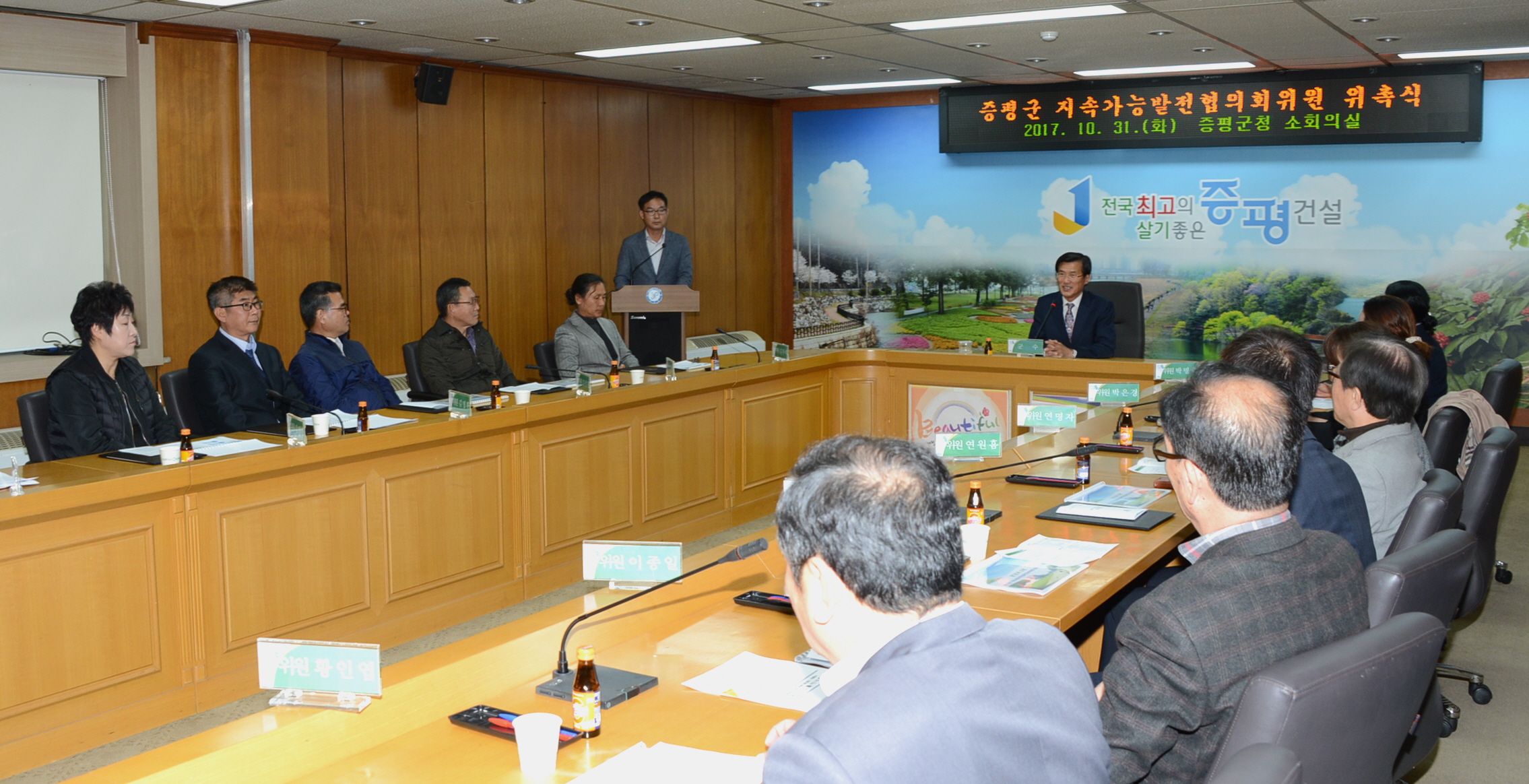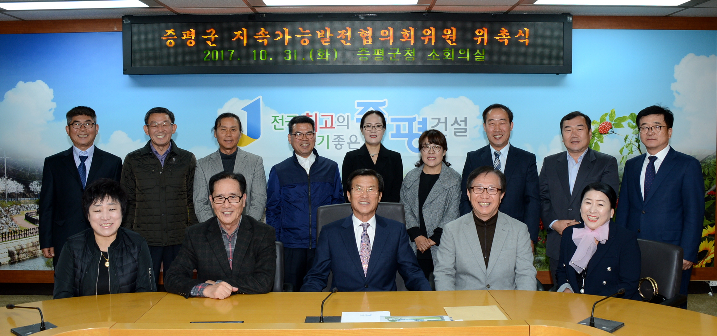증평군은 31일 군청 소회의실에서 지역 네트워크를 통한 지속가능 발전을 도모하기 위해 ‘증평군 지속가능발전협의회 위원’ 위촉식을 갖고. 친환경 도시대상을 통해 지속가능도시로 인정받은 증평군이 저탄소 녹색성장을 이어 가기로 했다.[보도자료실 참조]