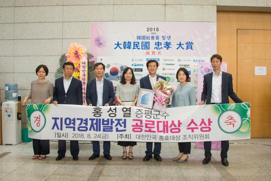 홍성열 증평군수가 대한민국 충효대상 조직위원회가 주최하고 대한민국신문기자협회가 주관한 2018 한국을 빛낸 대한민국 충효대상에서‘지역경제발전공로대상’을 수상했다.