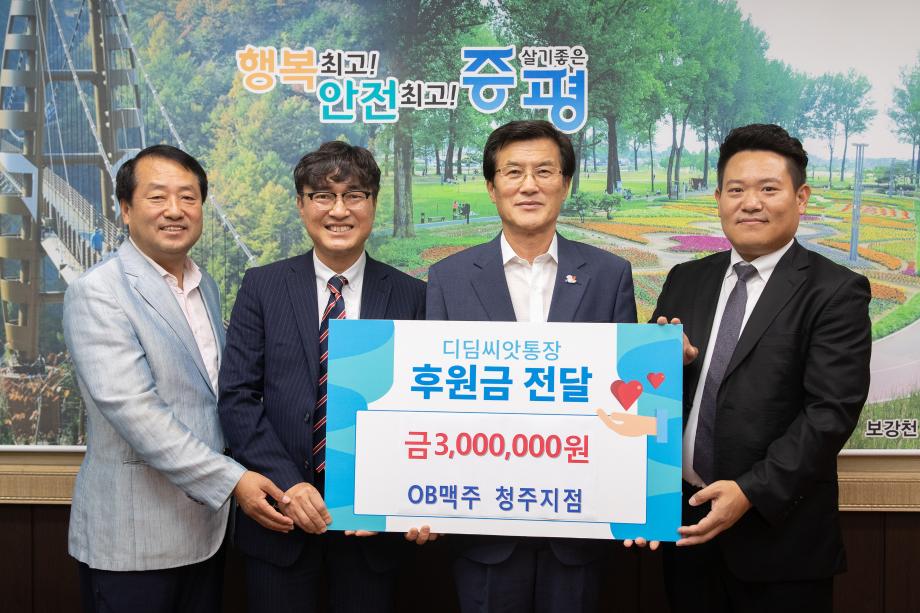 OB맥주 청주지점(지점장 한정규)은 26일 증평군청에 지역 저소득 아동의 자립을 위한 후원금 300만원을 전달했다.