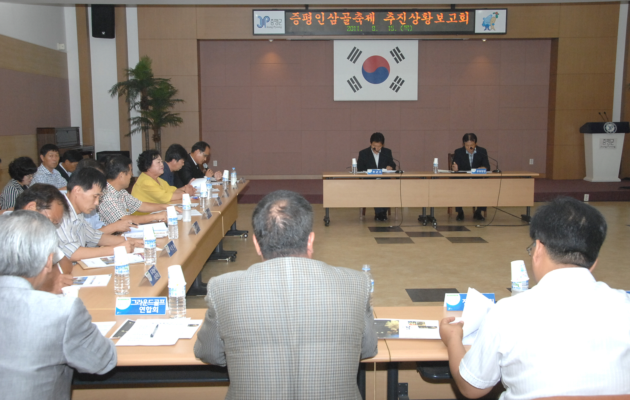 증평군은 15일 오후 2시 군청 소회의실에서 신병대 부군수, 김용돈 문화원 부원장을 비롯한 관련 기관·단체장과 관계 공무원 등 60여명이 참석한 가운데 ‘증평 인삼골축제’의 차질 없는 준비를 위한 축제 추진상황 보고회를 개최했다. [보도자료실 참조]