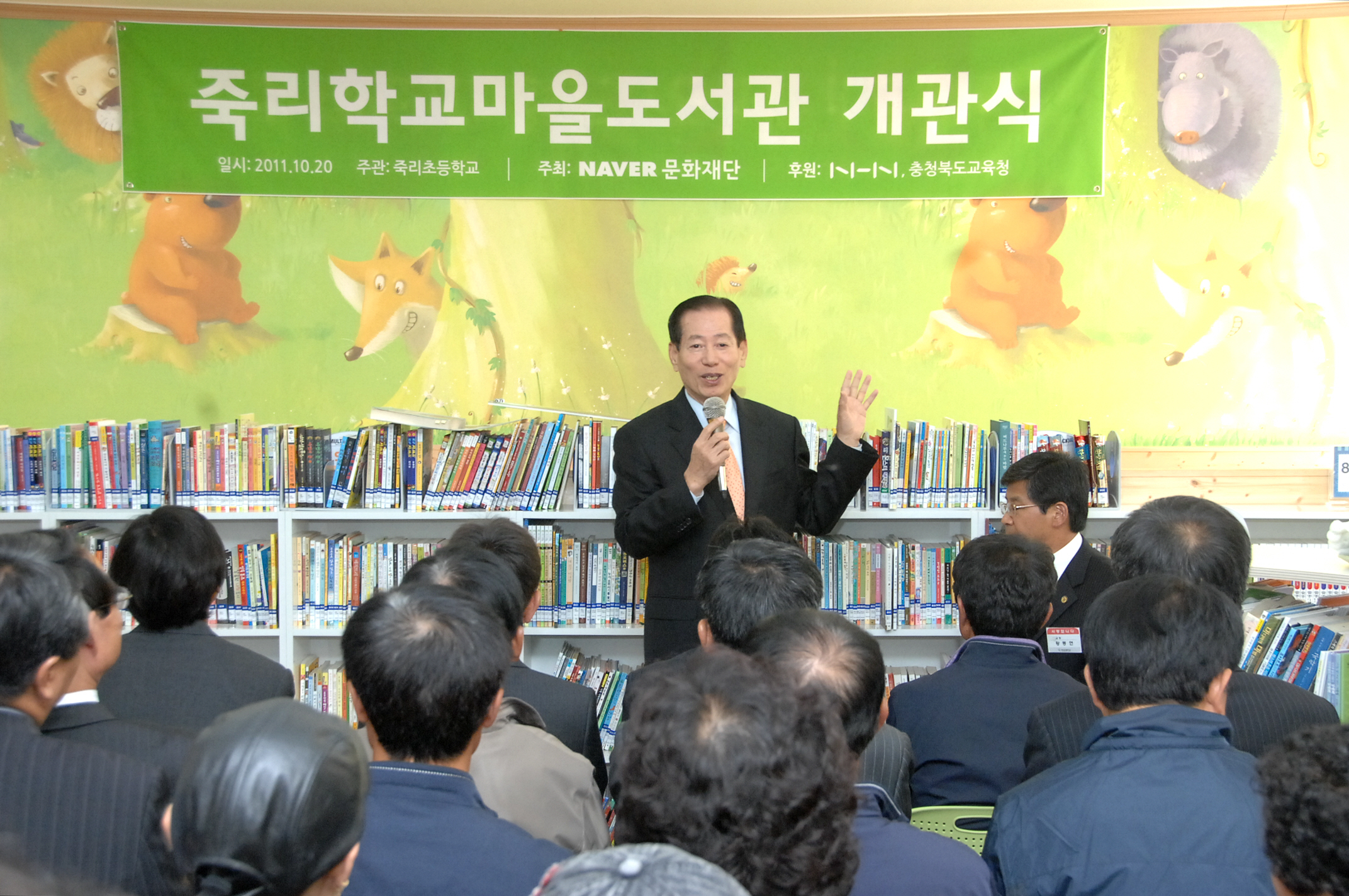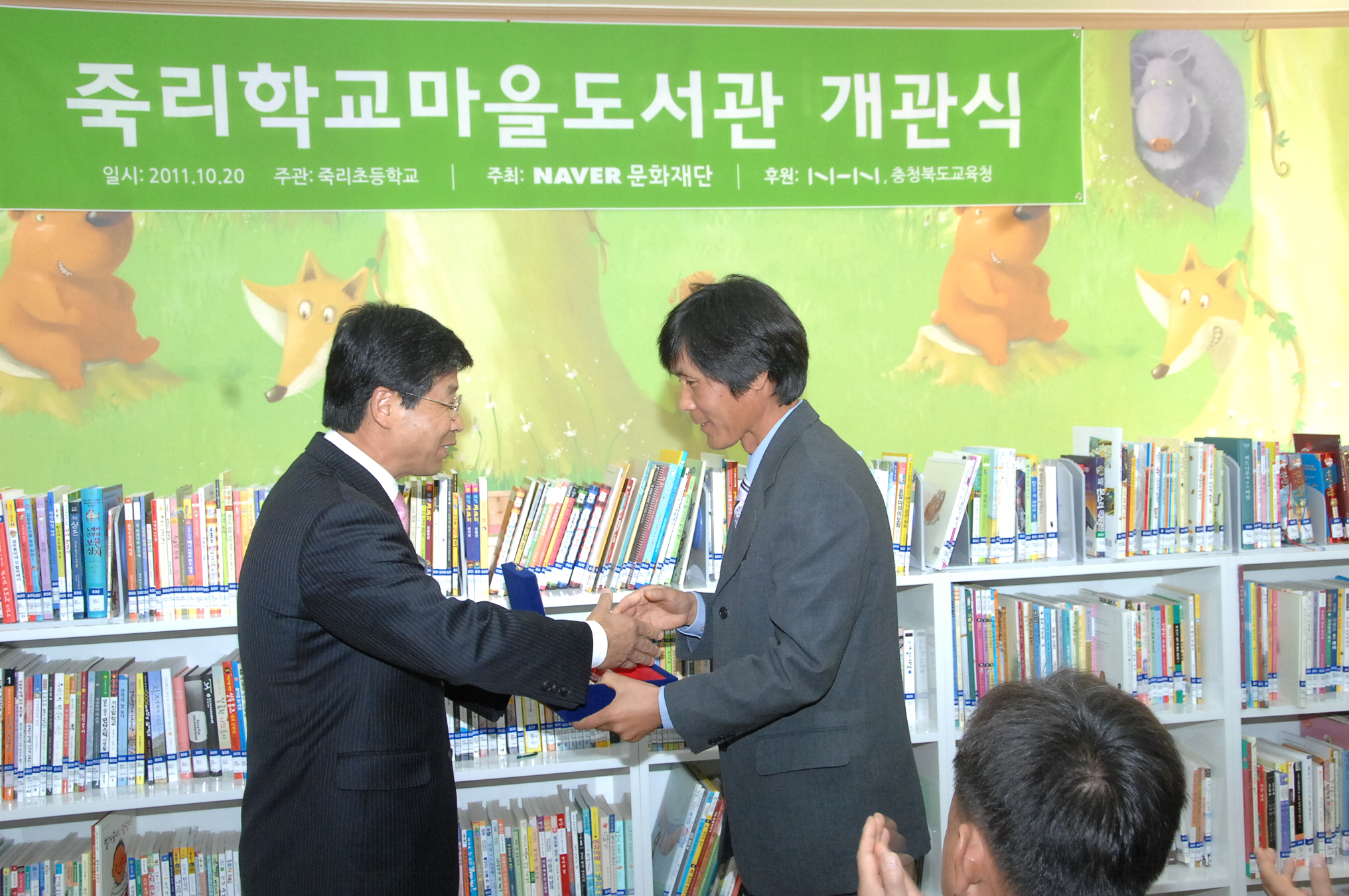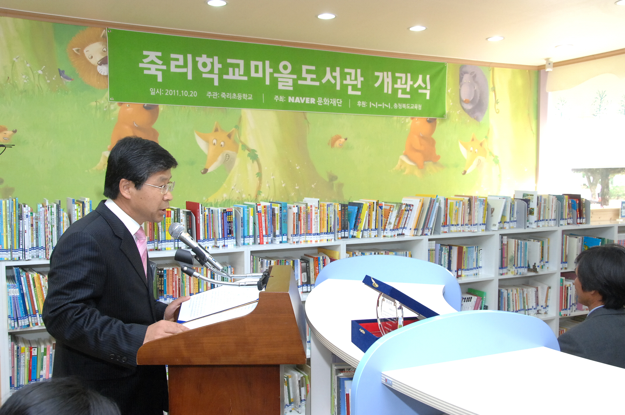 20일 오후 2시 30분 증평군 죽리초등학교에서는 신병대 증평군부군수, 김재룡 군의장, 박성현총동문회장, 황동연 죽리초등학교장, 이기혁 NHN(네이버) 대표이사를 비롯한 교사와 학생, 주민 등 800여명이 참석한 가운데 마을도서관 개관식이 열렸다. [보도자료실 참조]