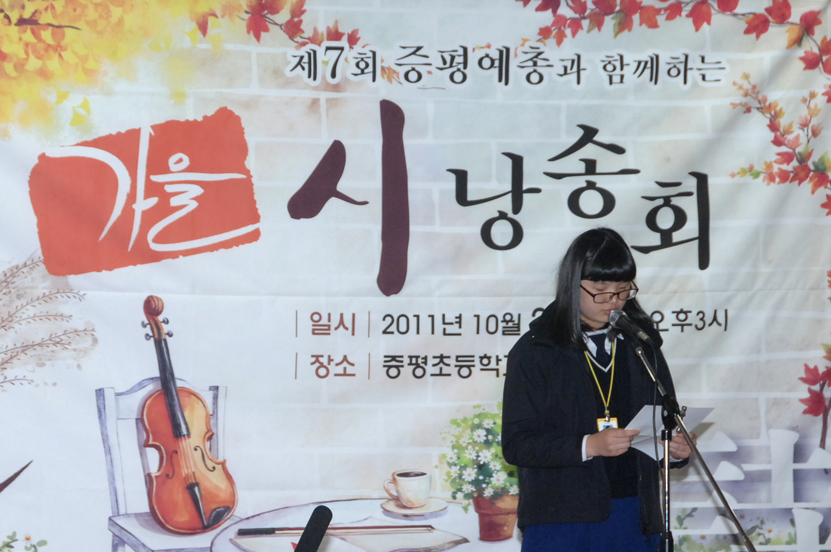 한국예술인총연합회 증평지회(회장 김장응)는 25일 오후 3시 제53회 증평초등학교 다목적실에서 홍성열 증평군수, 김재룡 군의장, 최건성 문화원장, 김장응 증평예총회장, 김서호 증평초등학교장 등을 비롯한 지역 문인들과 학생 등 200여명이 참석한 가운데 ‘제7회 증평예총과 함께하는 가을 시 낭송회”를 열었다.[보도자료실 참조]