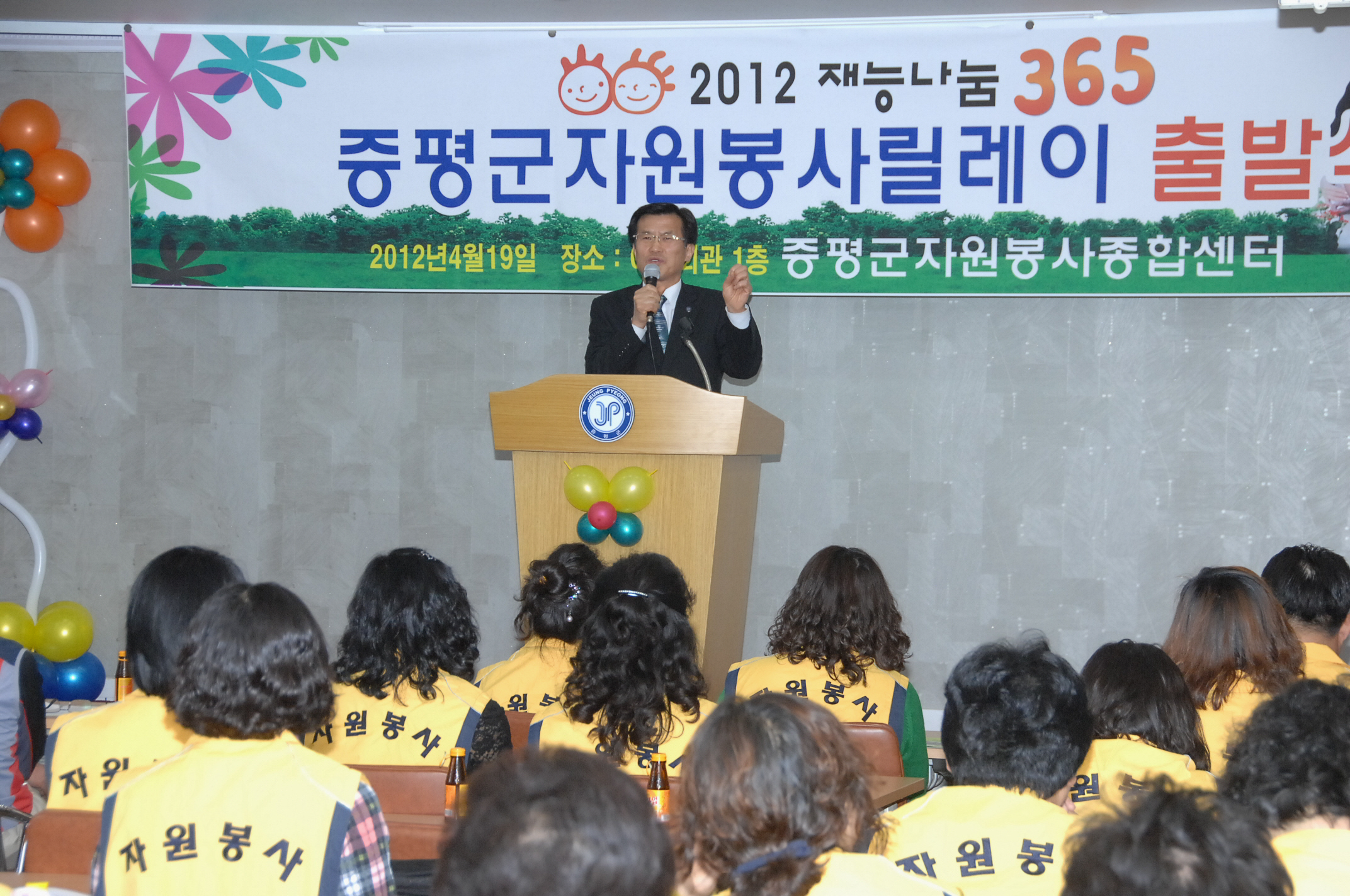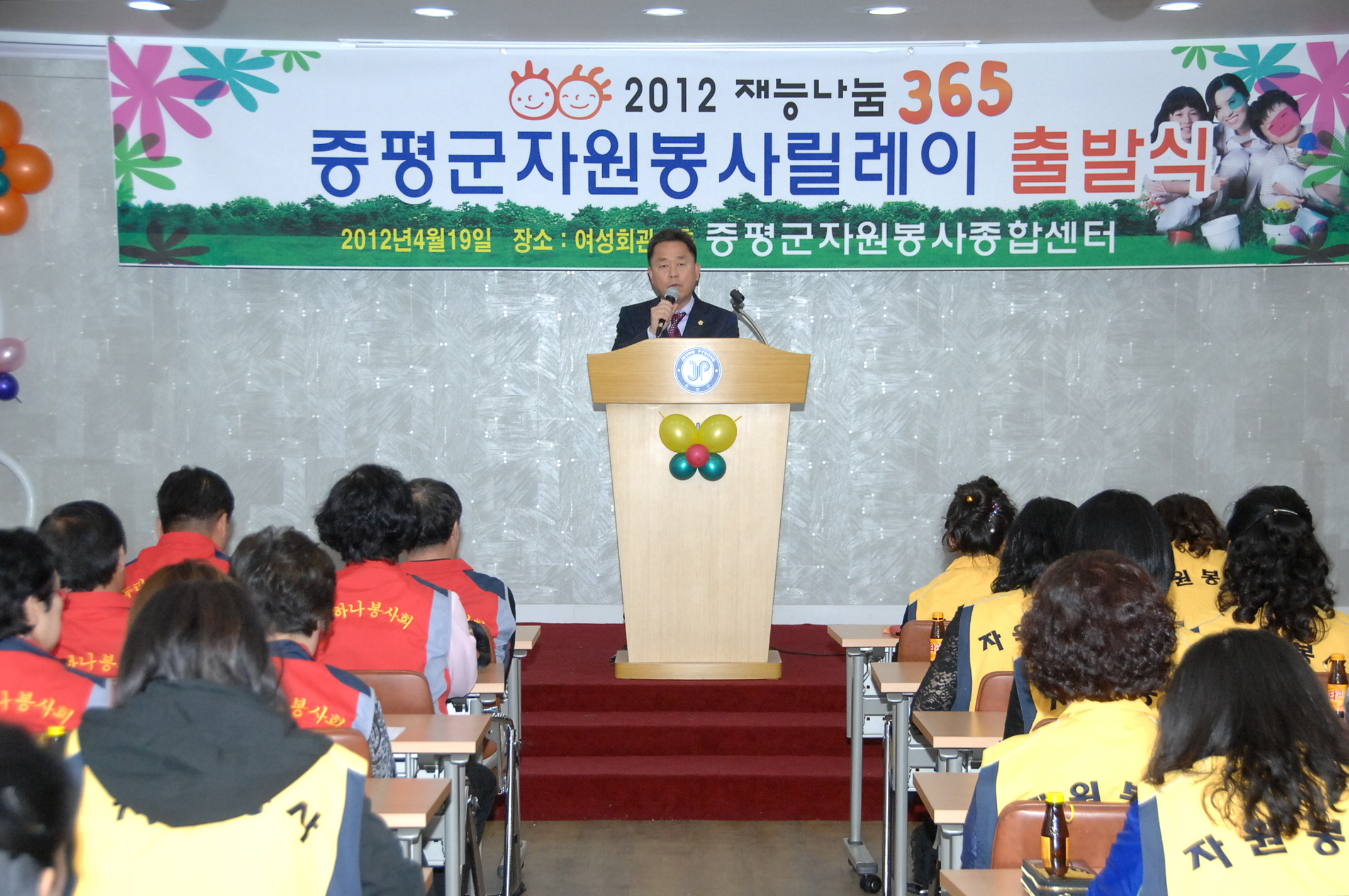 증평군자원봉사종합센터(센터장 신재영)에서 1년 365일 끊임없는 자원봉사 분위기를 조성하고 재능을 활용한 나눔 문화를 확산시키기 위해 추진하는 ‘2012 재능 나눔 365 자원봉사릴레이’ 출발식이 19일 오후 4시 증평군여성회관에서 개최됐다.[보도자료실 참조]