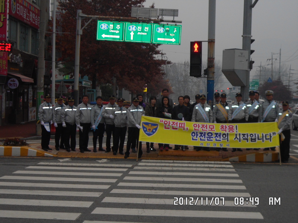 증평군은 7일 오전 8시 군청사거리에서 전국모범운전자연합회증평지회, 증평군청, 괴산경찰서 등에서 40여명이 참가한 가운데 교통사고줄이기 민관공동캠페인을 전개했다. [보도자료실 참조]