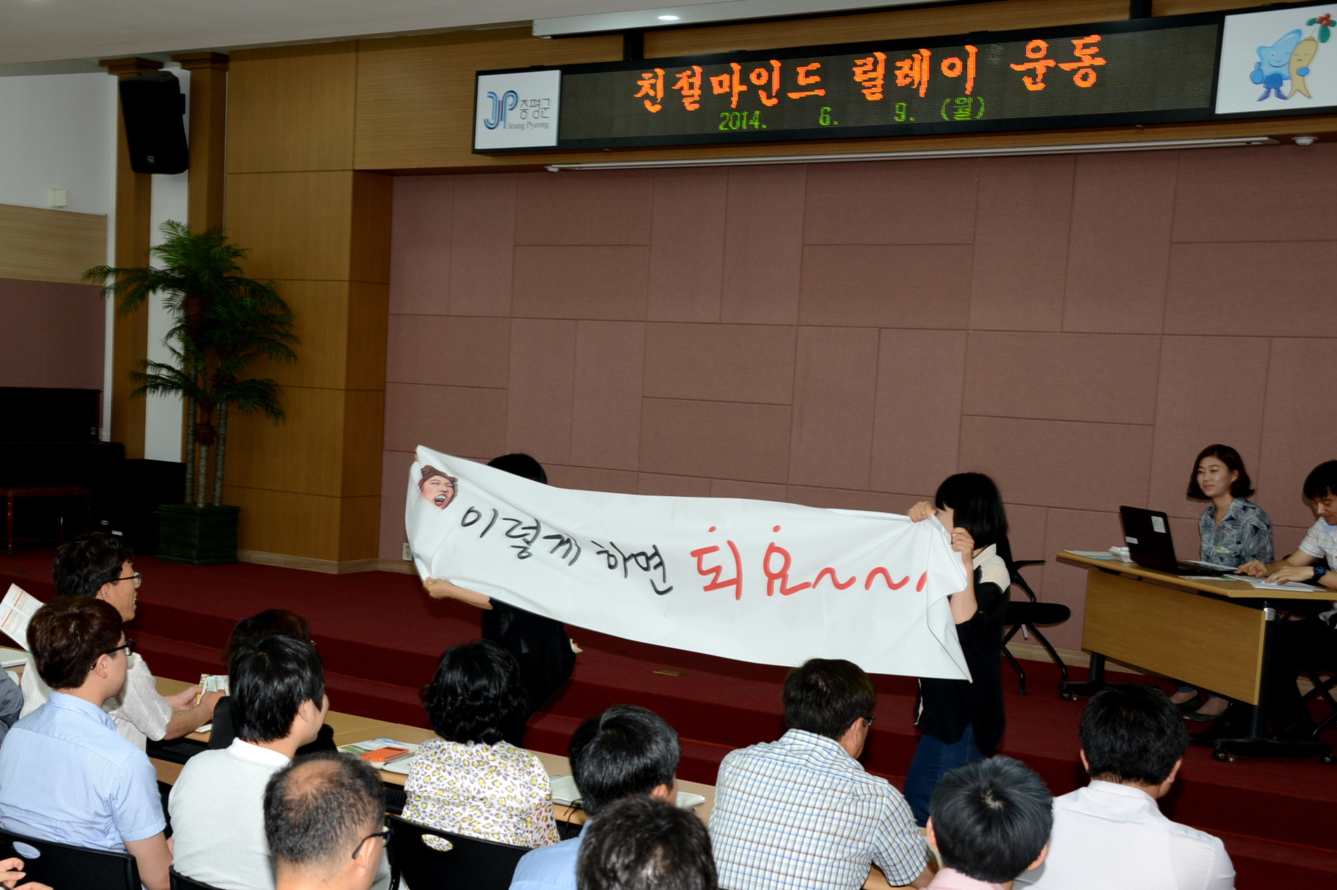 증평군은 9일 월례조회를 맞아 정부3.0에 맞춰 부서간 칸막이를 제거하고 소통․협력하는 밝은 직장분위기를 만들고자 친절마인드 릴레이 운동을 시행한다. [보도자료실 참조]