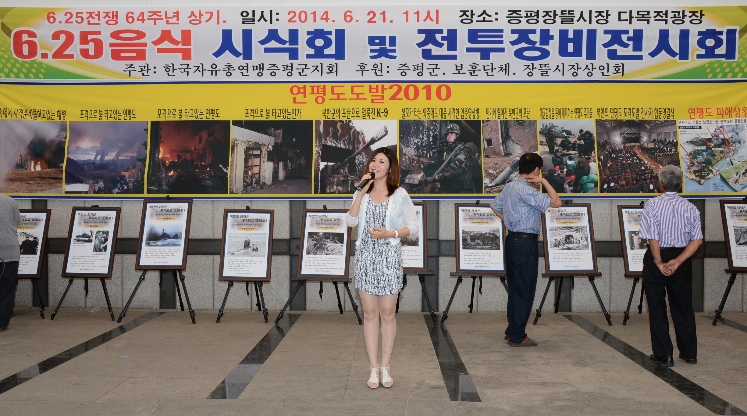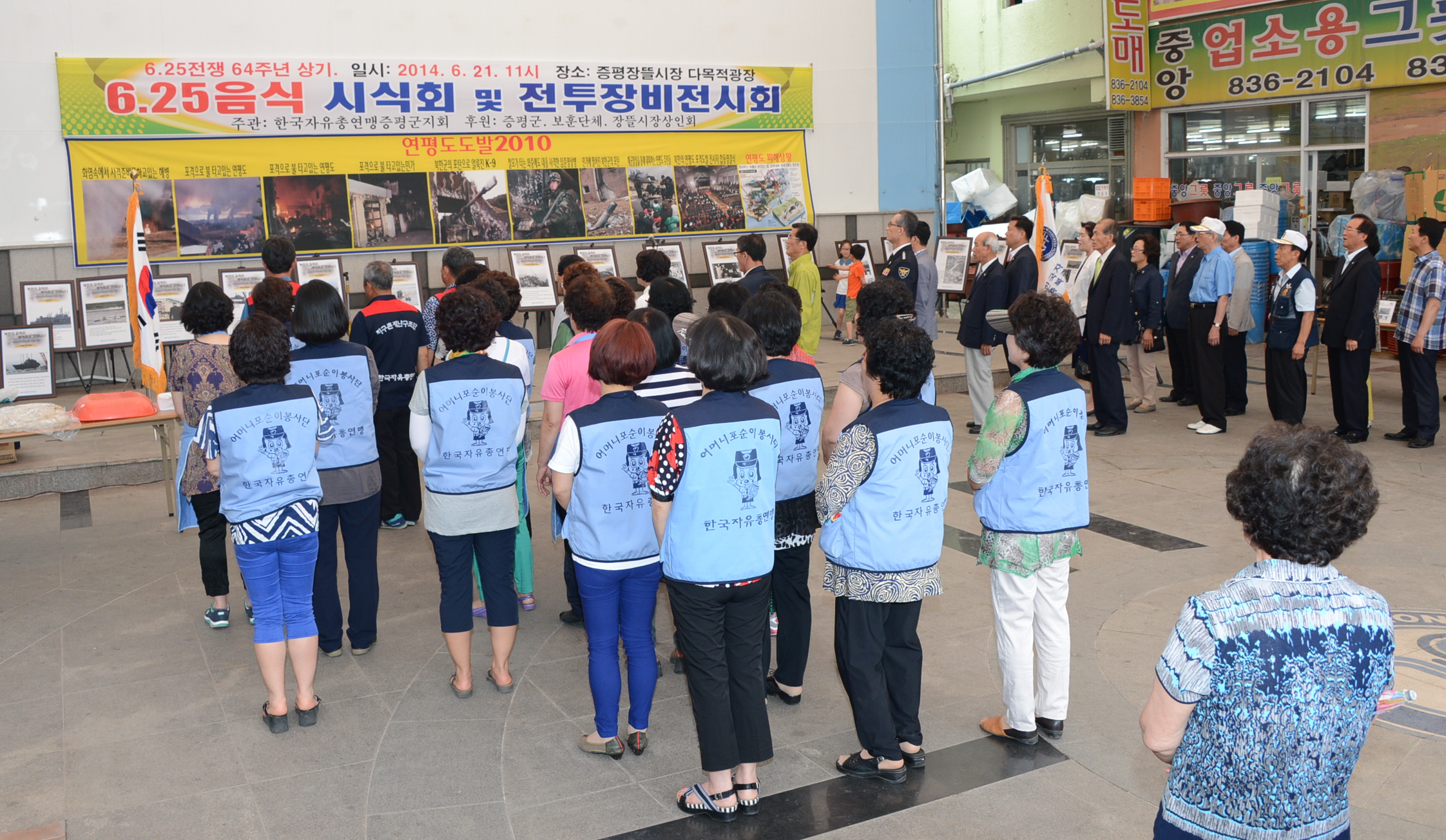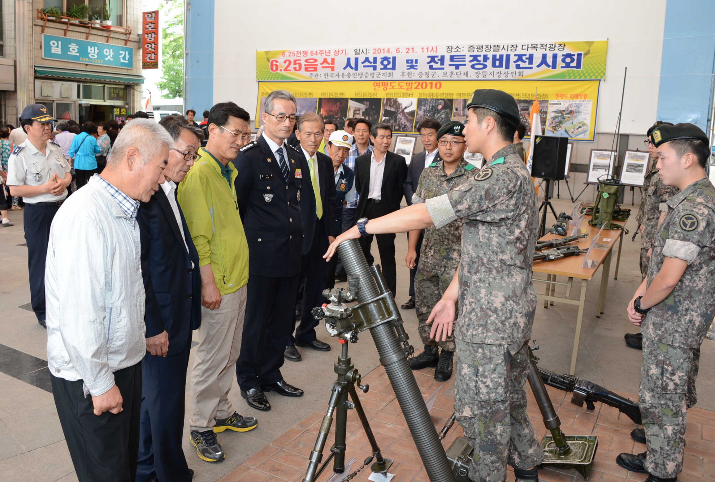 6․25 전쟁 64주년을 맞아 한국자유총연맹증평군지회(지회장 김덕중)에서는 21일 오전 11시부터 증평장뜰시장 다목적광장에서 6․25 음식체험 및 사진․전투장비 전시회를 개최했다. [보도자료실 참조]