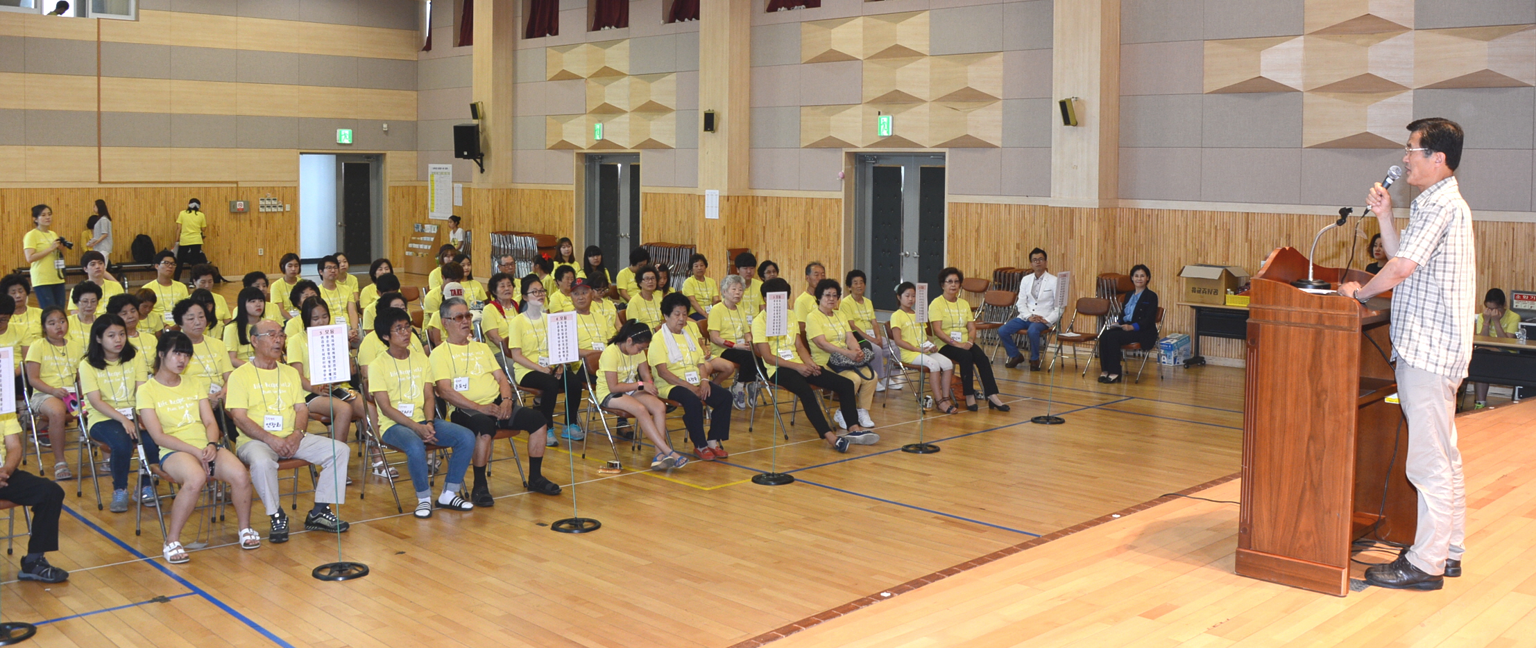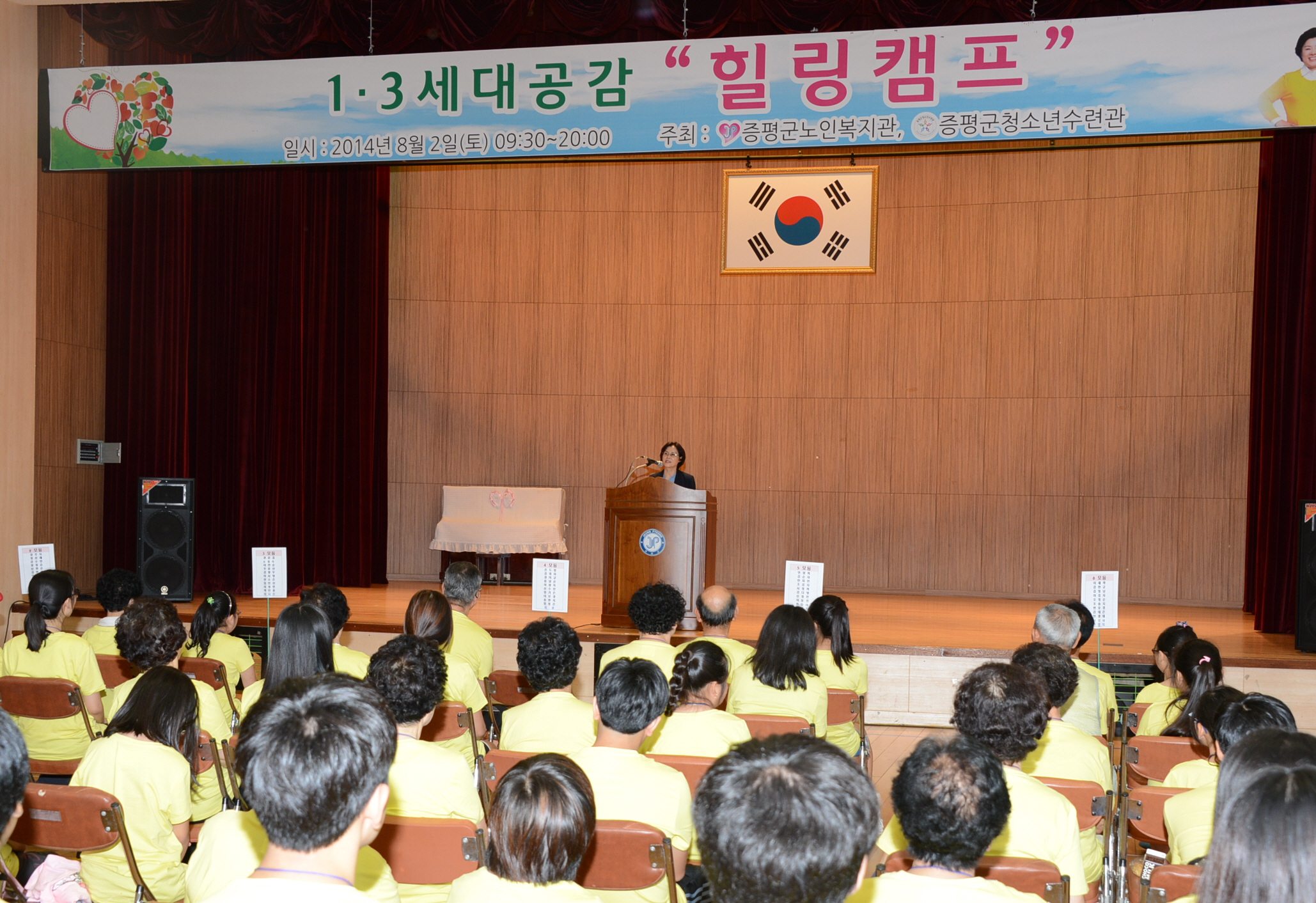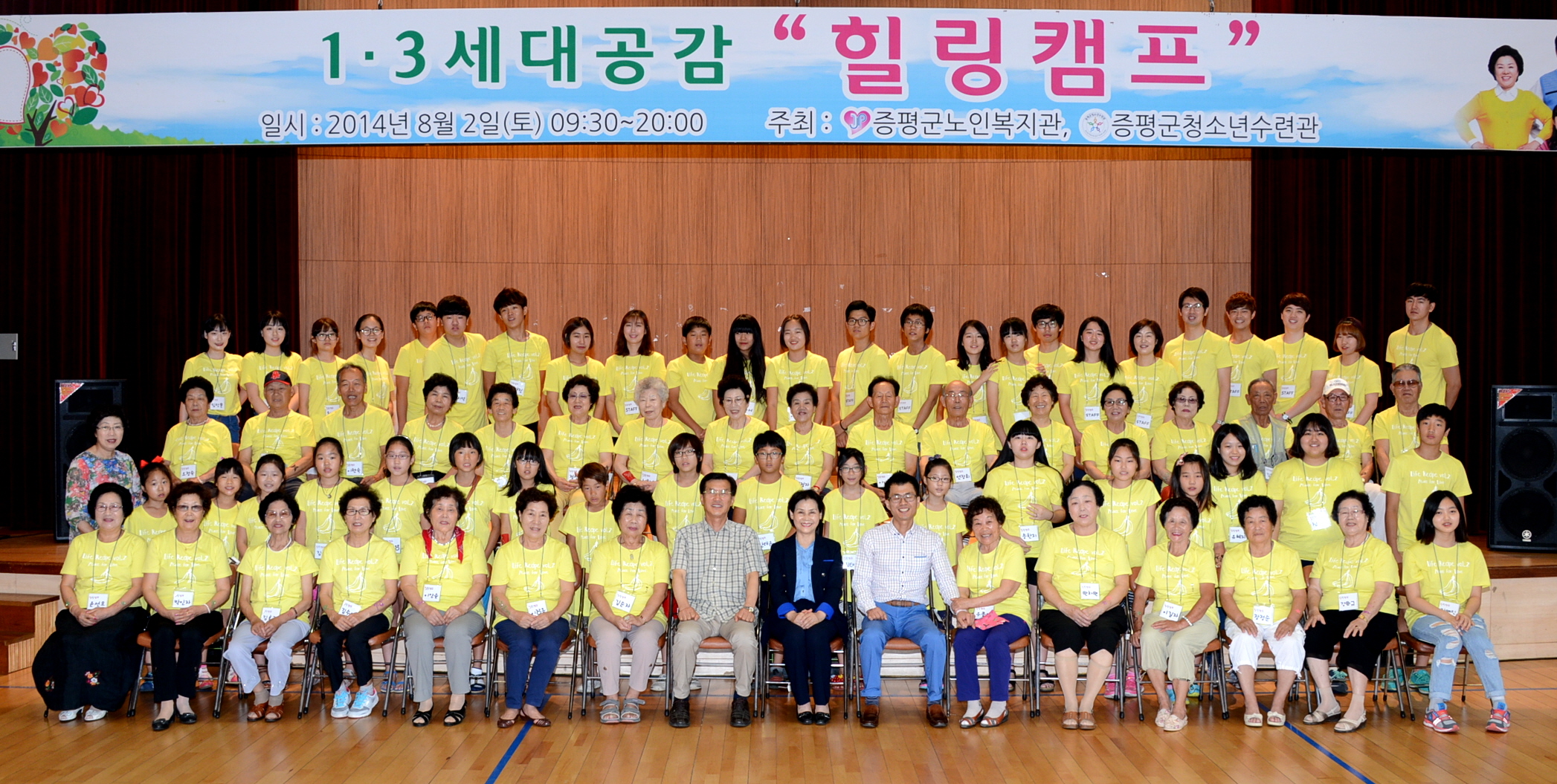 증평군노인복지관과 증평군청소년 수련관이 주관하는 1.3세대 공감사업 ‘힐링캠프’가 2일 증평군 청소년수련관 강당에서 홍성열 군수, 박영순 노인복지관장, 강경구 청소년수련관장을 비롯해 어르신 30명, 초등학생 30명, 봉사자 10명 등 70여명이 참여한 가운데 열렸다.[증평포토포커스 참조]