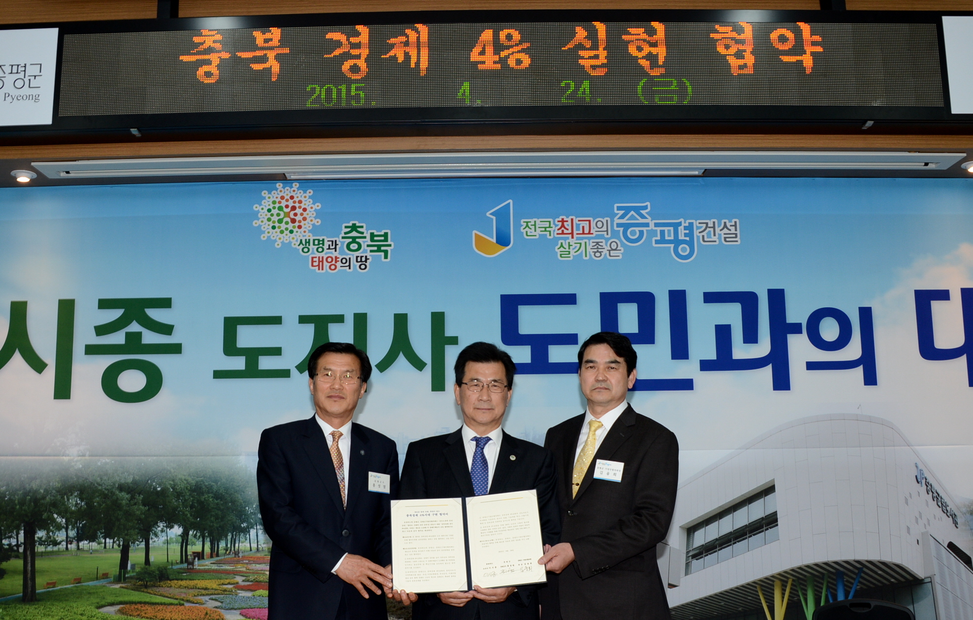 이시종 충청북도지사는 24일 증평군을 공식 방문하여 증평군민에게 도정을 설명하고, 도민과 대화하는 시간에 앞서 증평2산업단지 4개사 225억원 투자협약체결식을 가졌다.