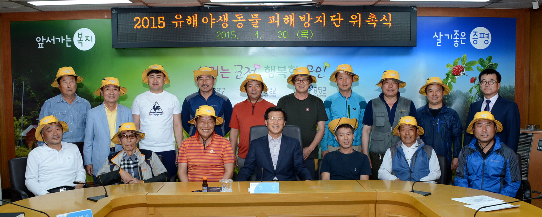 증평군은 유해야생동물로 인한 농작물 피해를 예방하기 위해 30일 군청 소회의실에서 유해야생동물 피해 방지단 위촉식을 가졌다.[보도자료실 참조]