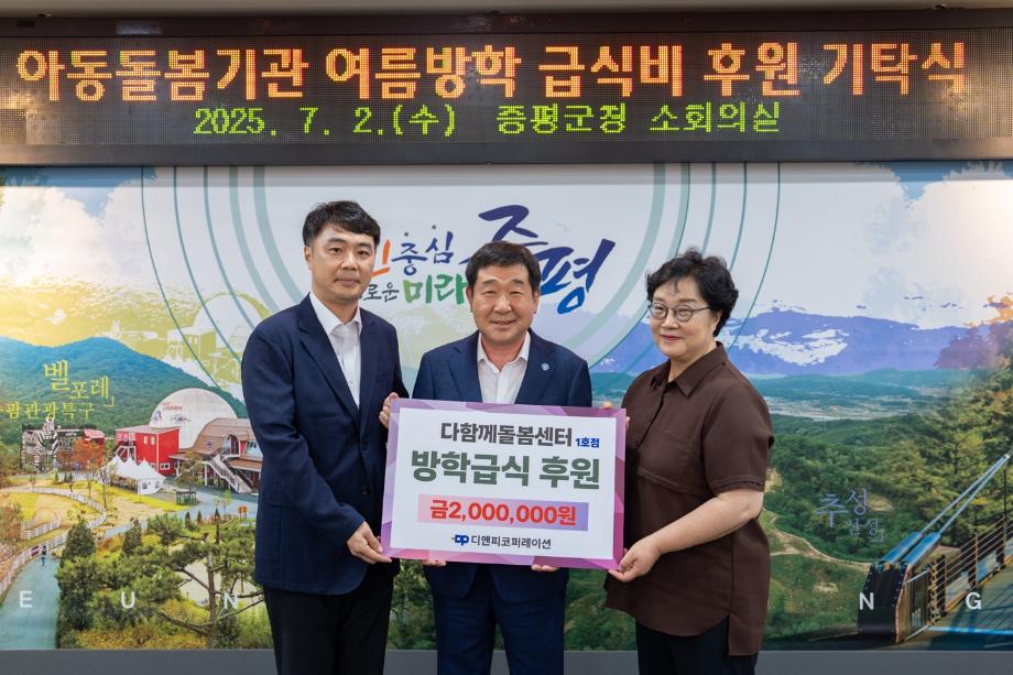 충북 증평군은 증평군기업인협의회(회장 장경식)와 지역 내 기업체인 디앤피코퍼레이션(대표 윤주민), ㈜윤준에스티(대표 김태수)가 여름방학 동안 아동돌봄기관의 급식 지원을 위해 총 700만 원을 후원했다고 2일 밝혔다.