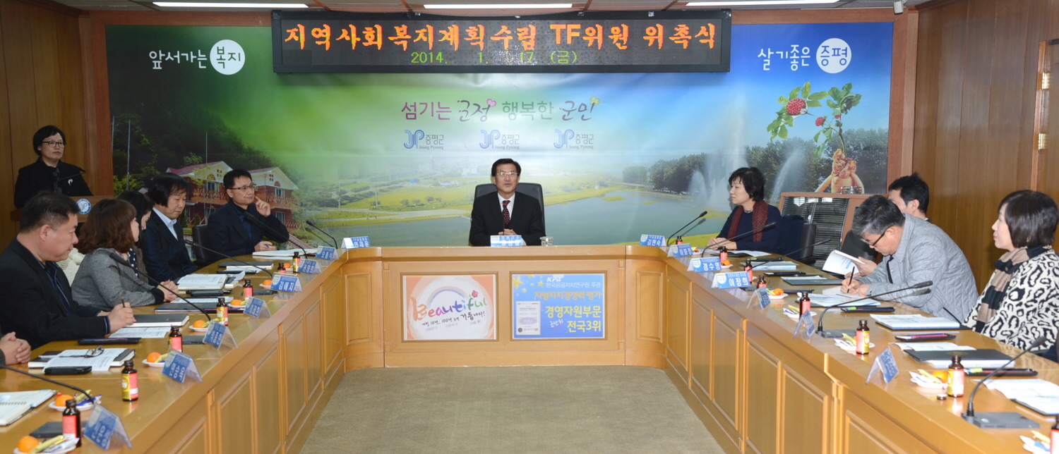 증평군은 17일, 증평군청 소회의실에서 2015년부터 2018년까지 증평군 복지의 중장기 계획 수립을 위한 TF팀 위촉식을 개최했다. [보도자료실 참조]