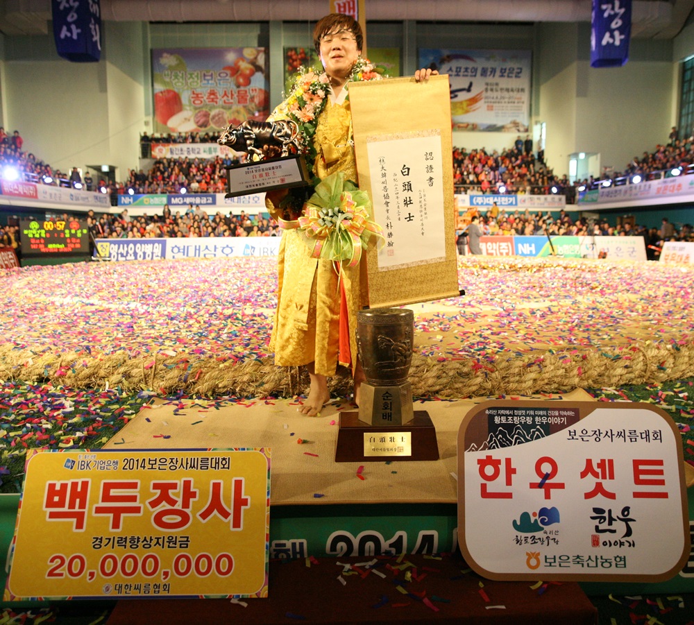 증평군청인삼씨름단 소속 김진이 30일 충청북도 보은군 보은국민체육센터에서 열린 "IBK기업은행 2014 보은장사씨름대회‘ 마지막 날 백두장사(150kg이하) 결정전(5판3선승제)에서 이재혁(울산동구청)을 3-0으로 물리치고 백두장사에 올랐다. [증평보도자료실 참조]