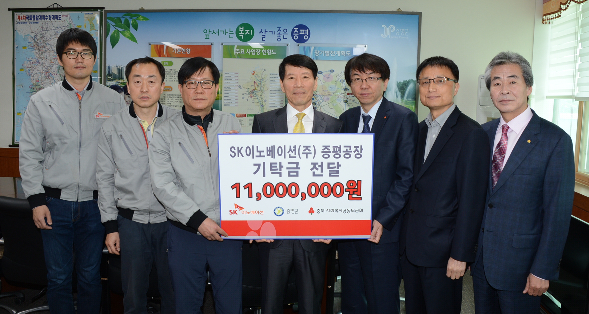 SK이노베이션(주)(대표 구자영)은 9일 오전 10시30분 증평군청 부군수실에서 박은상 증평부군수, SK이노베이션(주) 한양빈 부장, 충북사회복지공동모금회 정회영 사무처장 등 기관 관계자가 참석한 가운데 증평군에 사랑의 복지기탁금 1,100만원을 전달했다. [보도자료실 참조]
