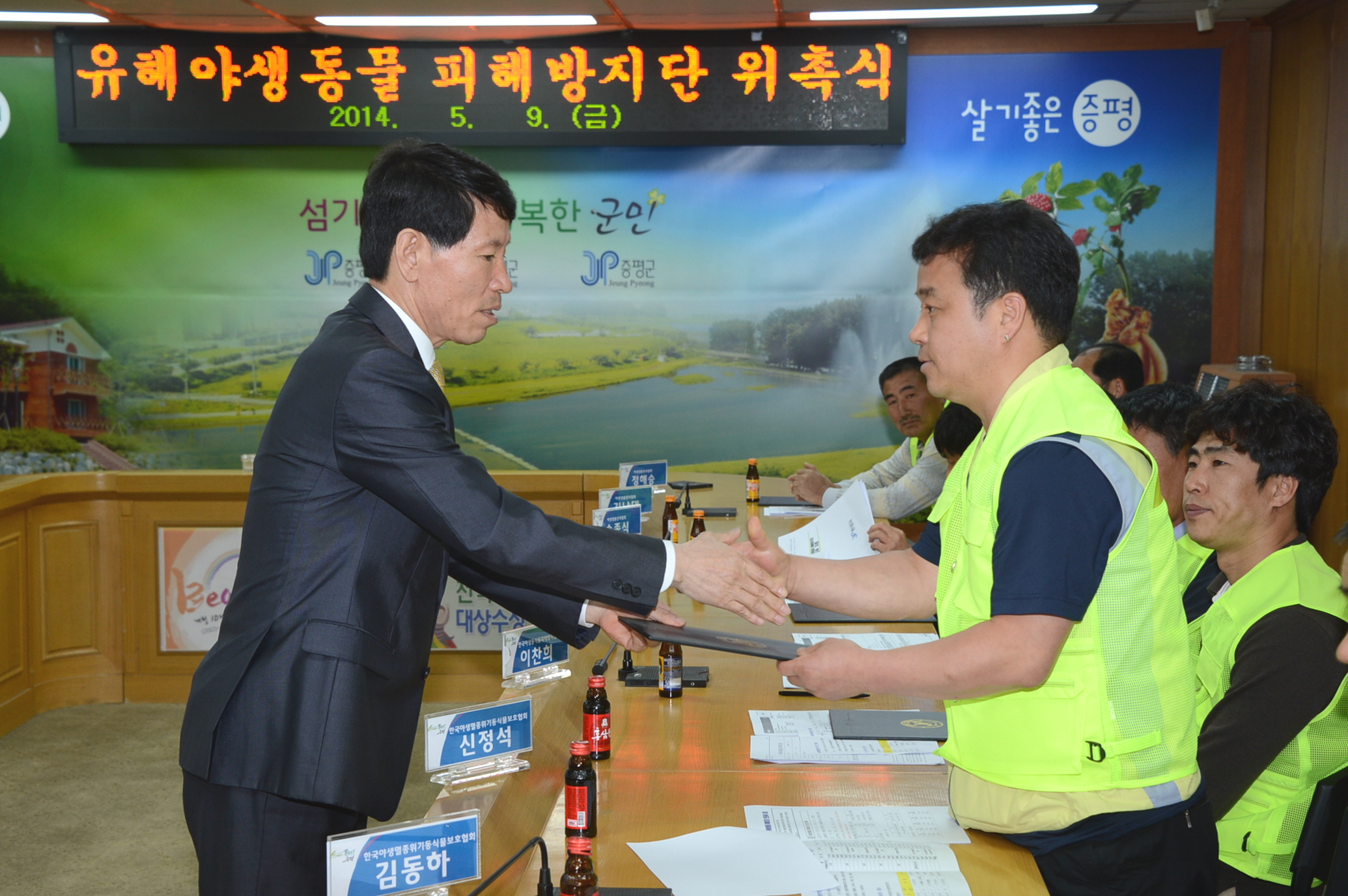 증평군은 유해야생동물로 인한 농작물 피해를 사전에 예방하기 위해 9일 군청 소회의실에서 유해야생동물 피해방지단 위촉식을 가졌다. [보도자료실 참조]