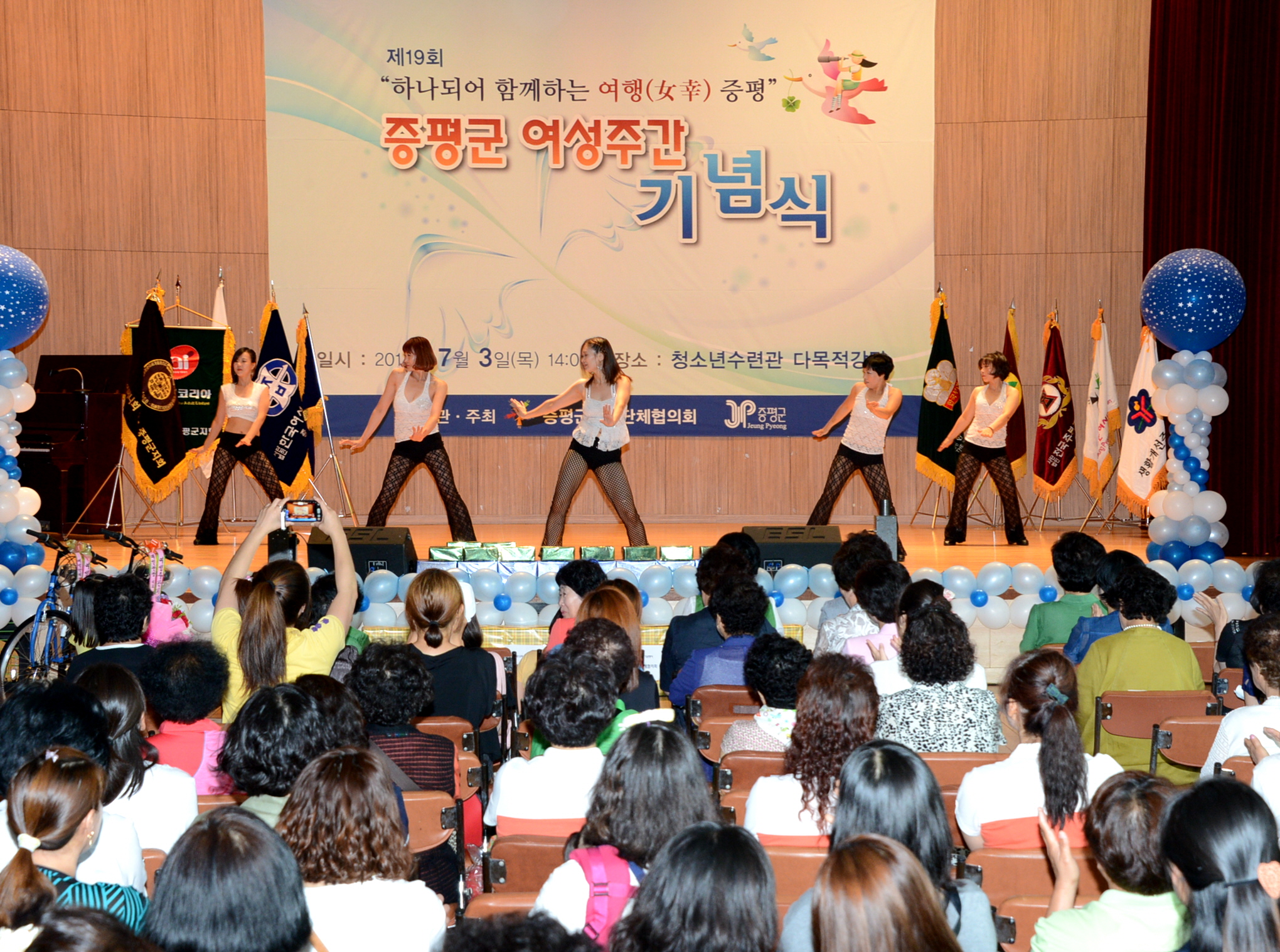증평군여성단체협의회(회장 강춘희)는 3일 증평군청소년수련관에서 제19회 여성주간을 맞아 ‘하나 되어 함께하는 여행(女幸) 증평’을 주제로 단체회원, 결혼이민여성, 지역주민 등 약 300여명이 참여한 가운데 기념행사를 가졌다. [보도자료실 참조]