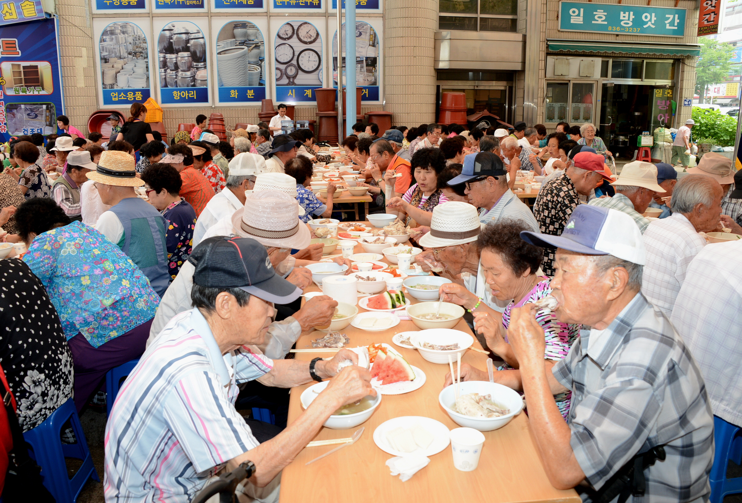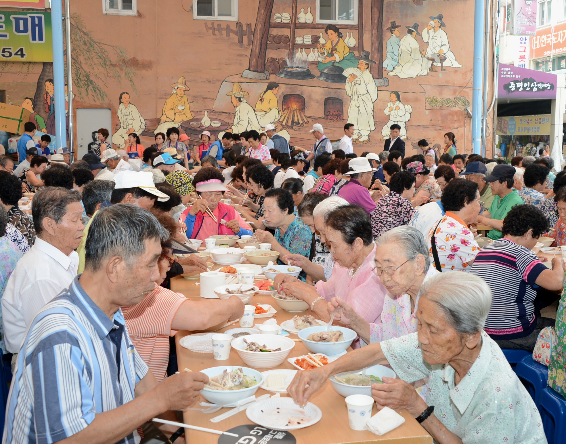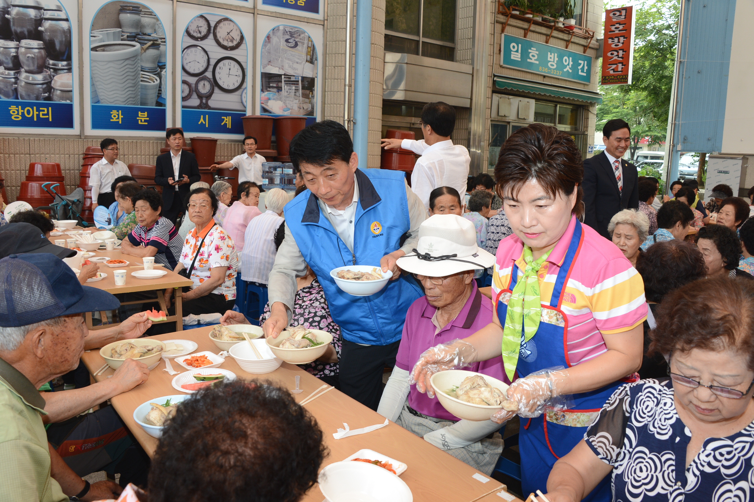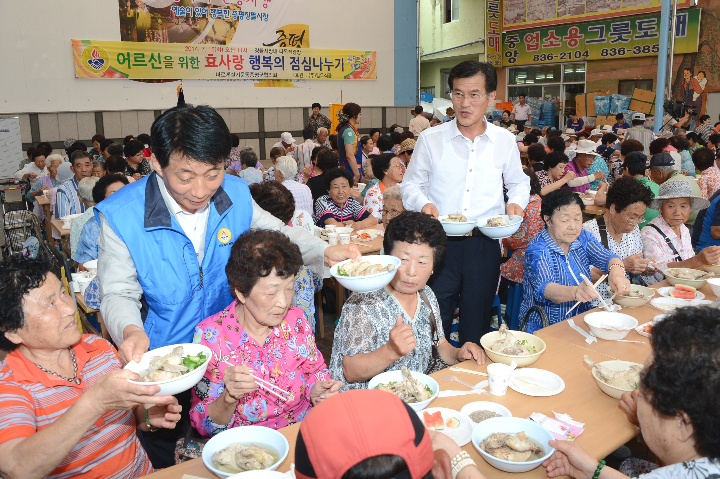 바르게살기운동증평군협의회(회장 김규환)는 삼복더위의 시작인 초복에 앞서 15일 오전 11시에 증평장뜰시장 다목적광장에서 독거노인 및 어르신 500명을 초청, ‘孝, 사랑의 점심 나눠주기’행사를 열었다. [보도자료실 참조]