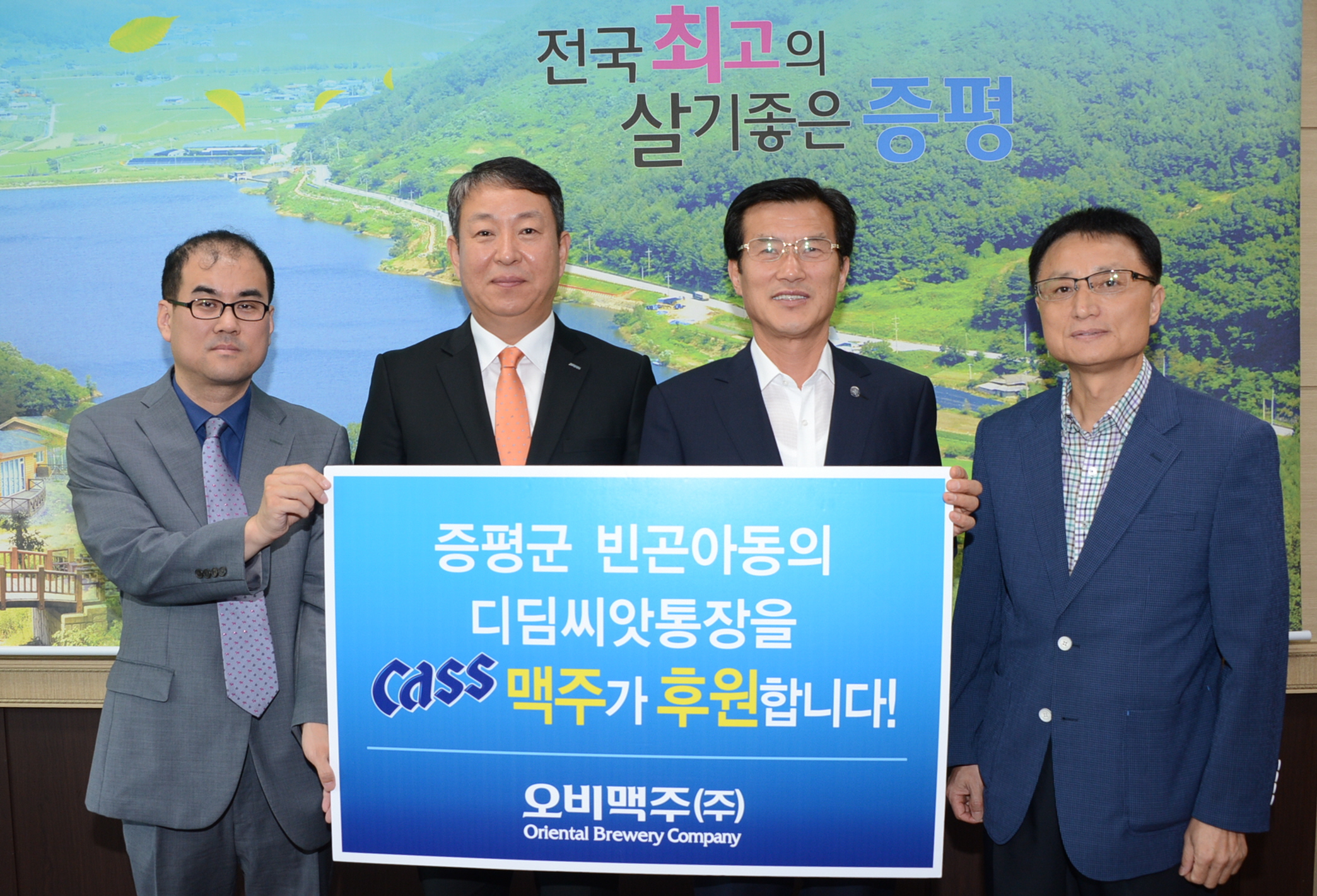 오비맥주 청주지점은 28일 증평군청에서 오비맥주 청주지점 박주용 지점장과 홍성열 증평군수 등이 참석한 가운데 ‘내 고장 대표맥주 카스가 함께하는 사랑의 희망나눔 캠페인’ 일환으로 관내 저소득 아동을 위한 후원금 250만원을 전달했다.[증평포토포커스 참조]